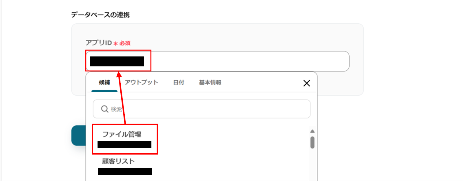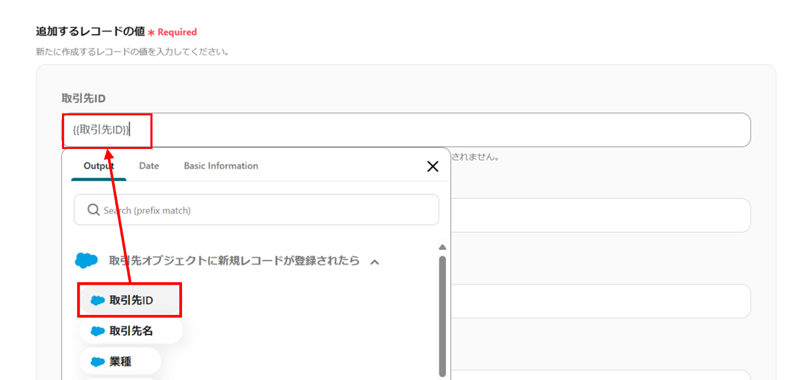 (3)「データベース操作の詳細設定」画面から、追加するレコードの値をアウトプットから選択します。