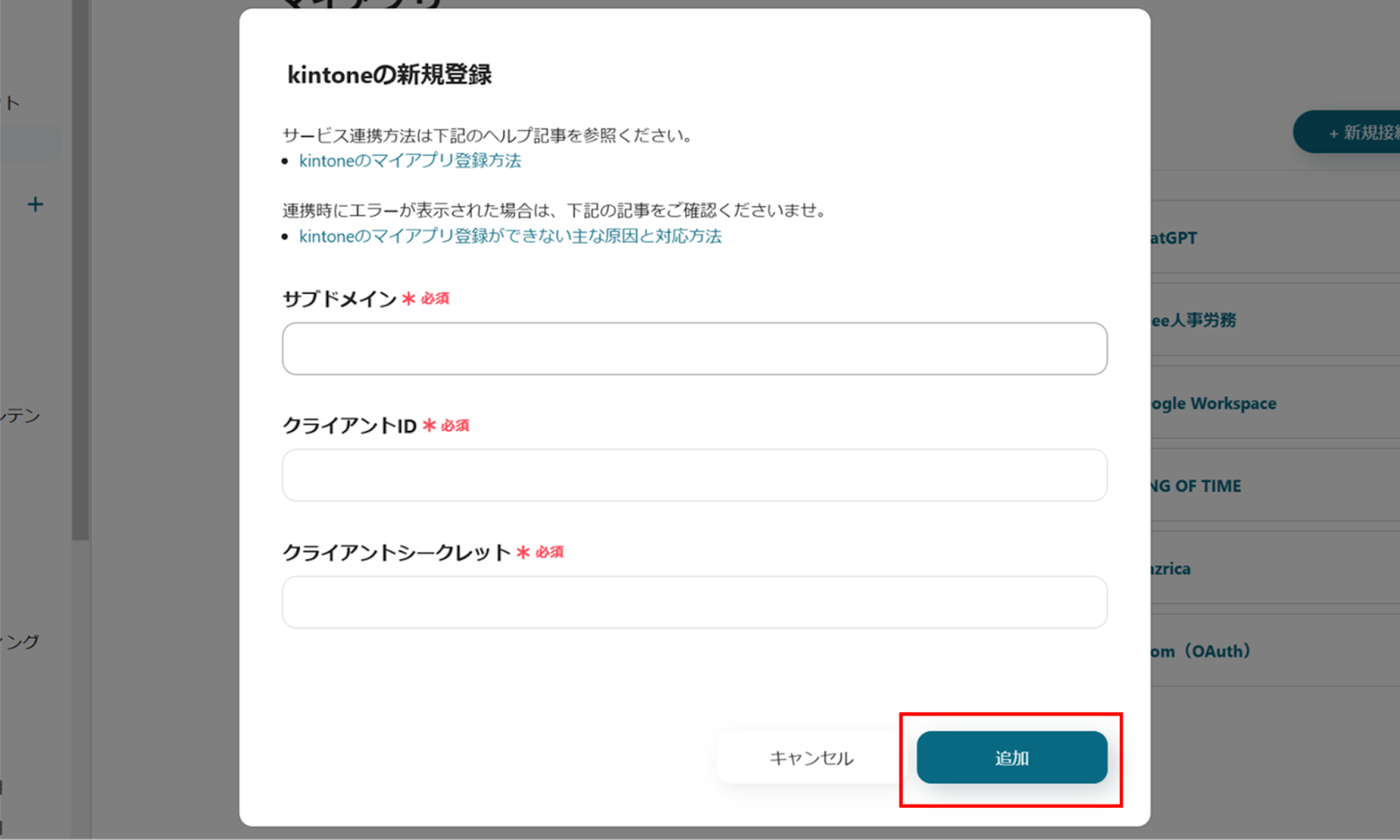 (5)kintoneの新規登録画面が出るので、サブドメイン、クライアントID、クライアントシークレットの3箇所を入力し、追加をクリックします。
