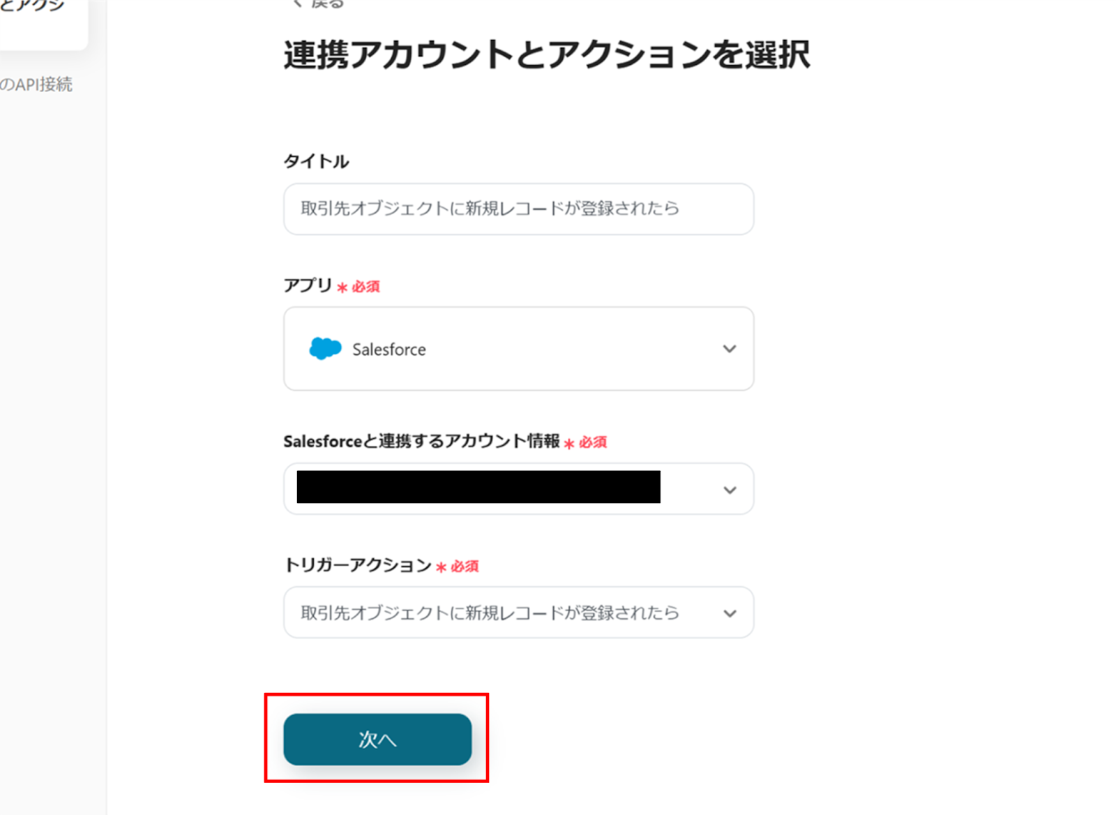 (2)Salesforceの「連携アカウントとアクションを選択」画面から、Salesforceと連携するアカウント情報に誤りがないかを確認し、トリガーアクションは「取引先オブジェクトに新規レコードが登録されたら」のままで「次へ」をクリックします。