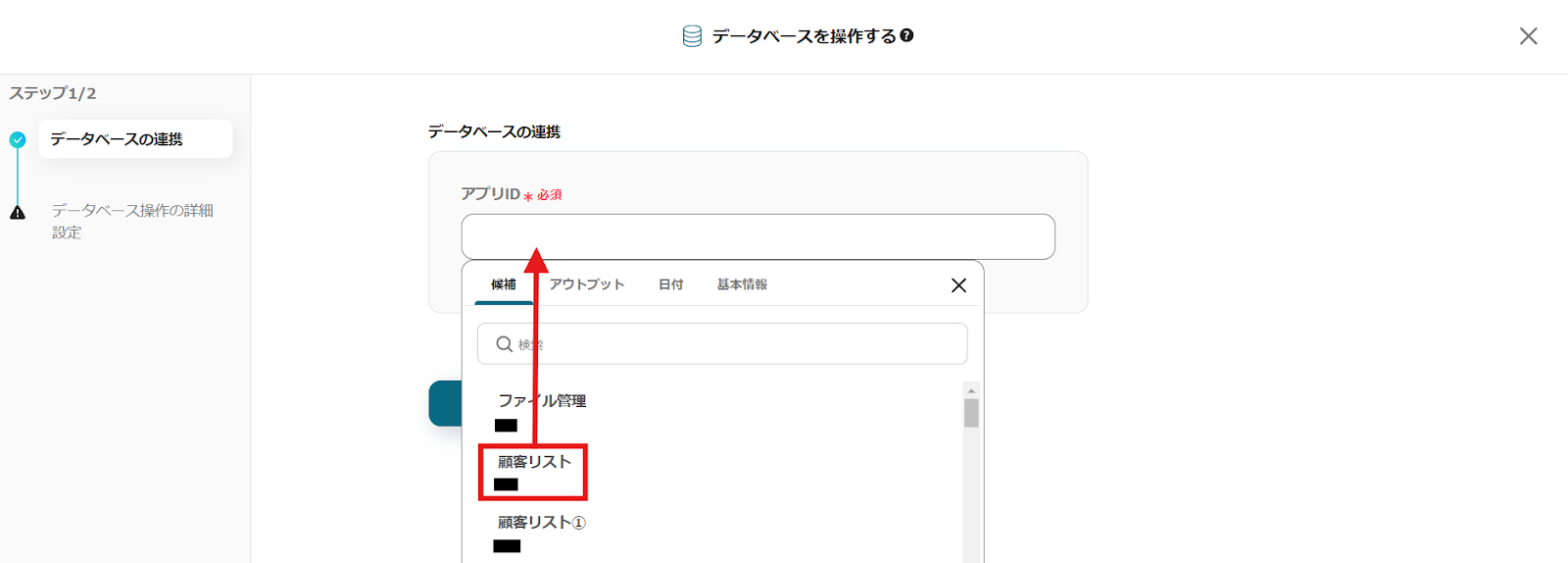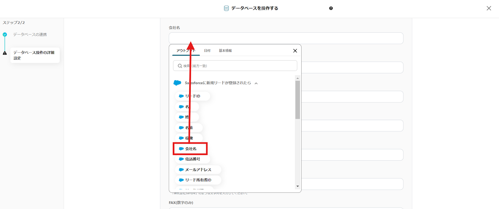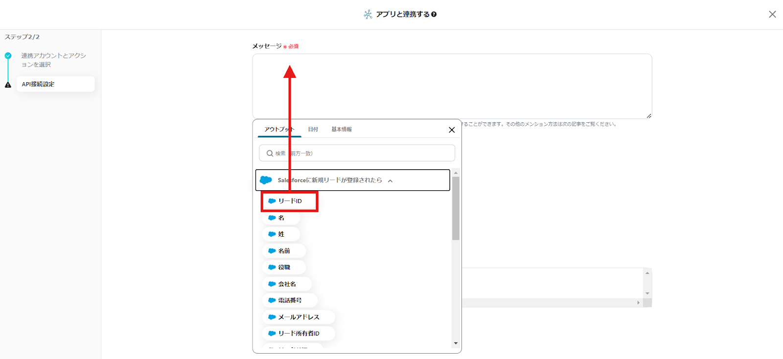 指定したアプリの項目が表示されます。リードデータを挿入したい箇所をクリックしてください。