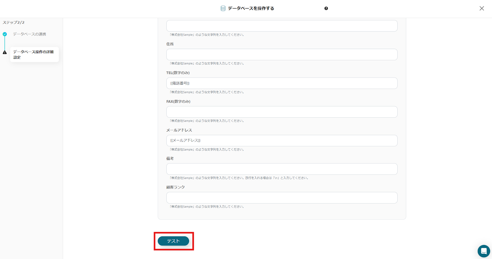 必要な項目を入力し終えたら下部にあるテストボタンを押してください。