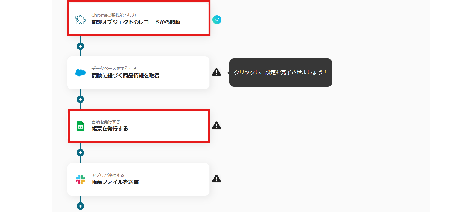上記のフローの場合、特定の商談レコードからChrome拡張機能を起動して商談データを取得します。さらにGoogle スプレッドシートに作成済みの帳票の雛形と商談データを紐づけ、帳票を自動作成した後にSlackへ送信可能です。