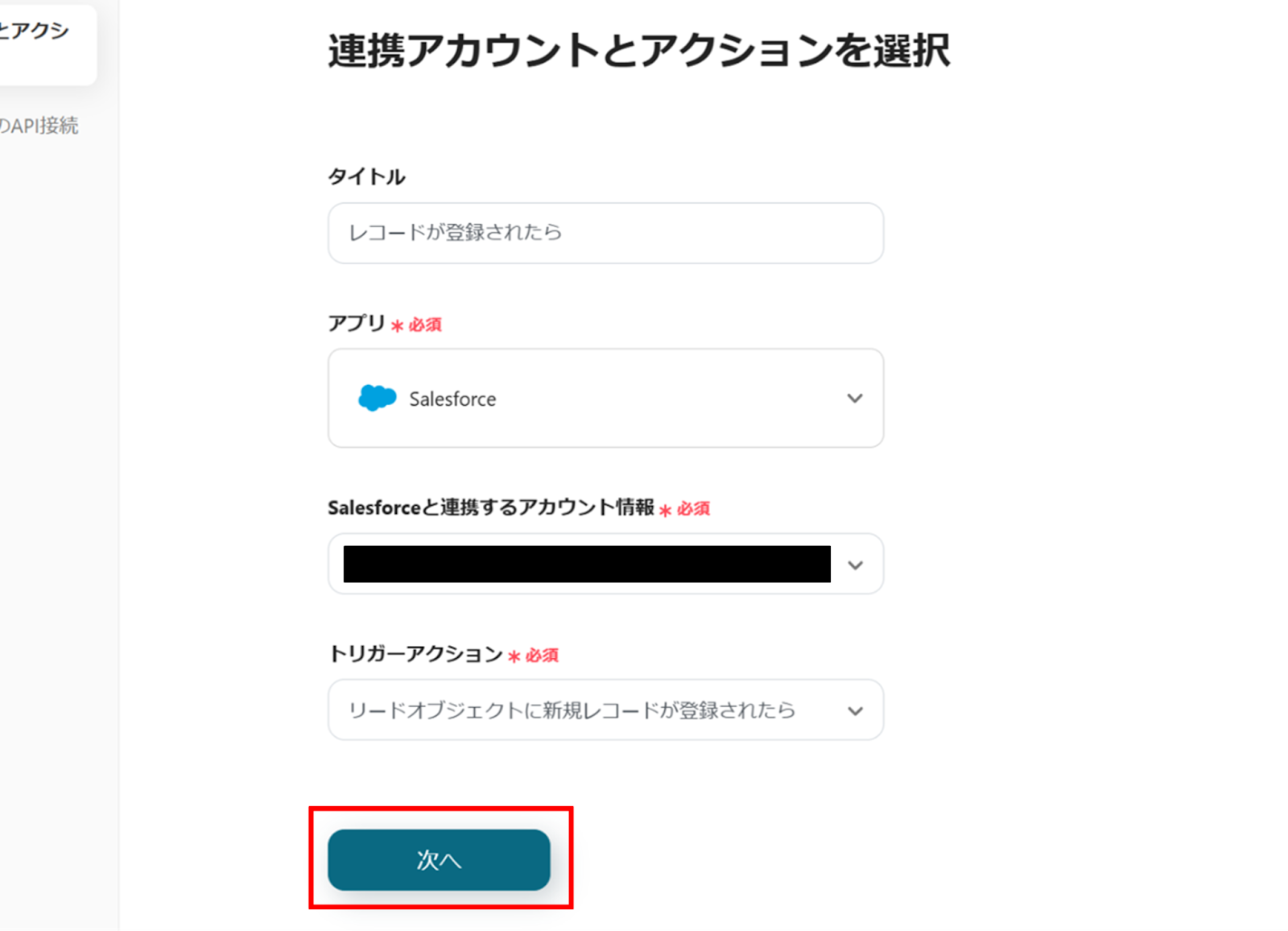 (2)Salesforceの「連携アカウントとアクションを選択」画面から、Salesforceと連携するアカウント情報に誤りがないかを確認し、トリガーアクションは「リードオブジェクトに新規レコードが登録されたら」のままで「次へ」をクリックします。