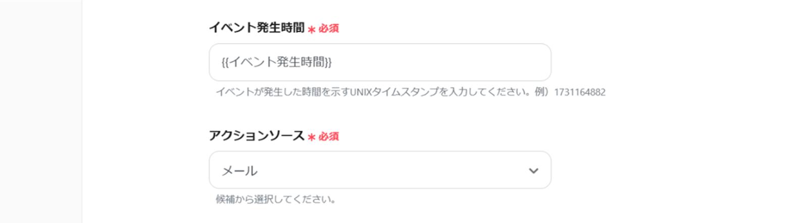 下へ進み、イベント発生時間、アクションソースを入力します。