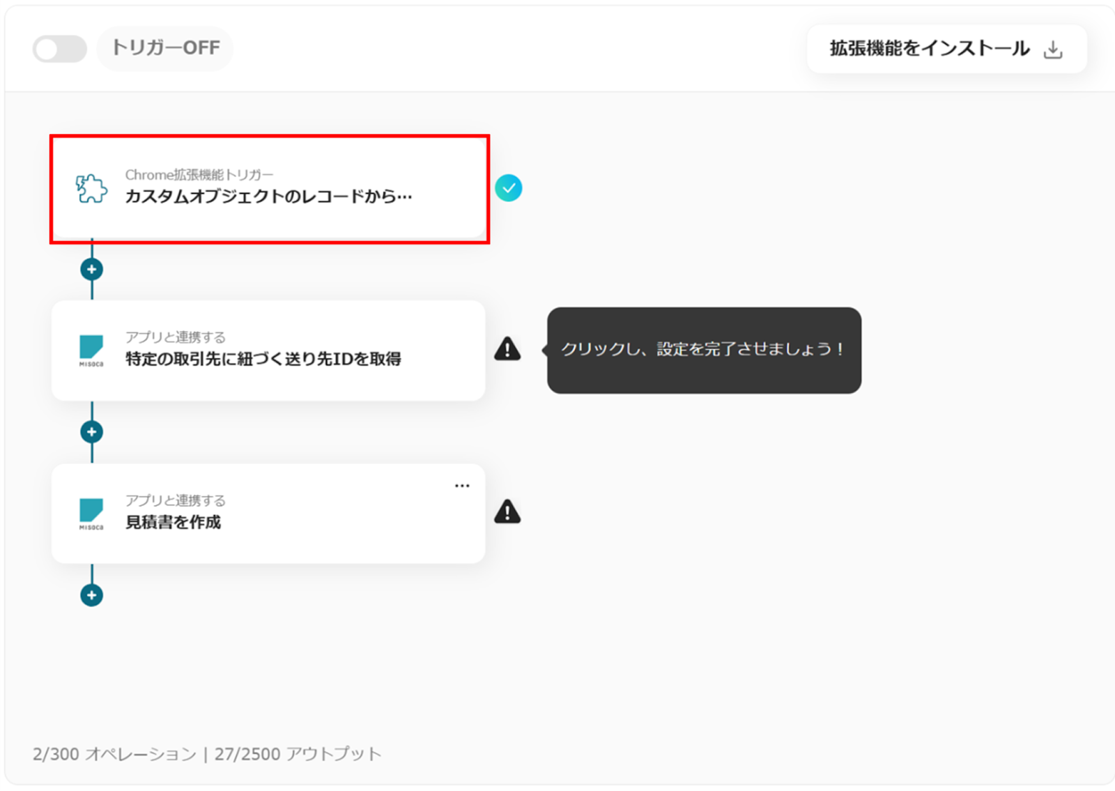 (2)「拡張機能で起動するアプリの連携アカウントとアクションを選択」画面から、Chrome拡張機能を使用したトリガーを使用することで、Salesforce上から直接トリガーを起動させることができます