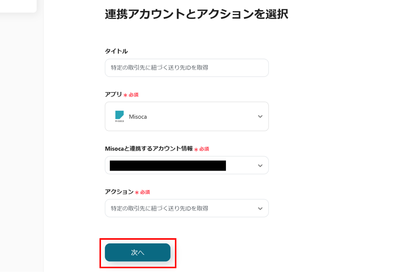 (2)Misocaの「連携アカウントとアクションを選択」画面から、Misocaと連携するアカウント情報に誤りがないかを確認し、アクションは「特定の取引先に紐づく送り先IDを取得」のままで「次へ」をクリックします。