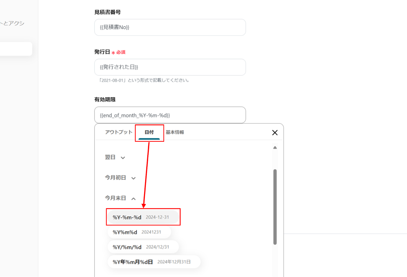(3)「API接続設定」画面から、必須項目の発行日、送り先ID、見積内容をアウトプットから選択します。