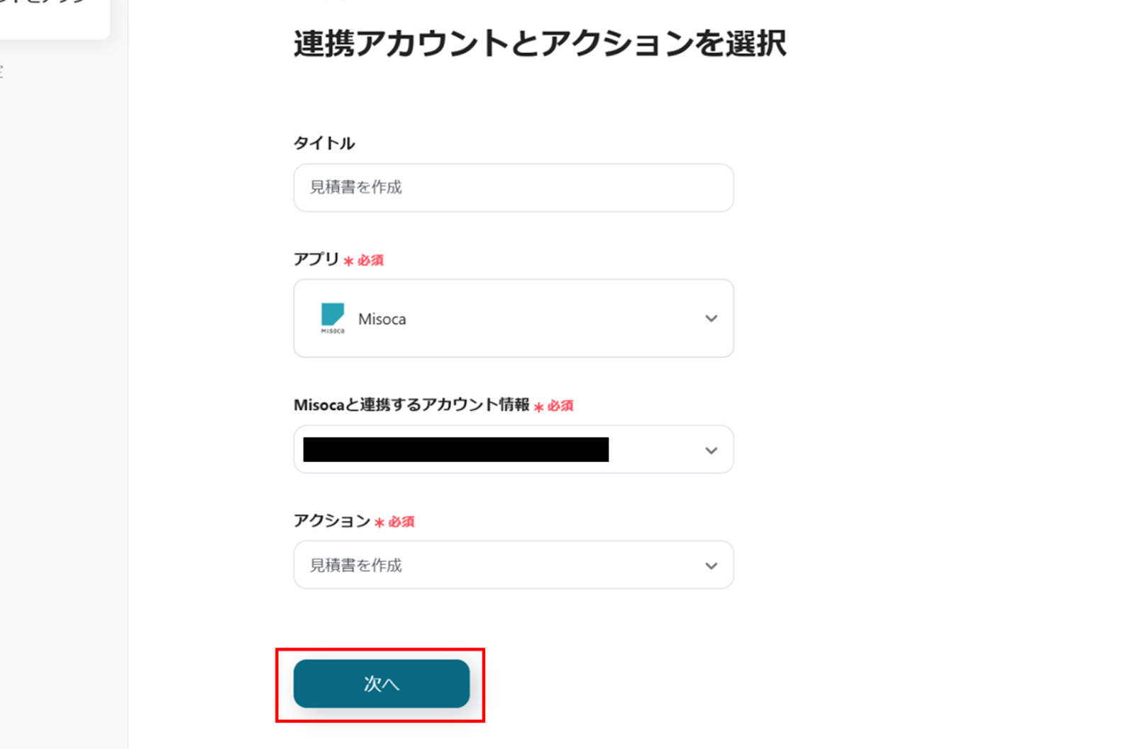 (2)Misocaの「連携アカウントとアクションを選択」画面から、Misocaと連携するアカウント情報に誤りがないかを確認し、アクションは「見積書を作成」のままで「次へ」をクリックします。