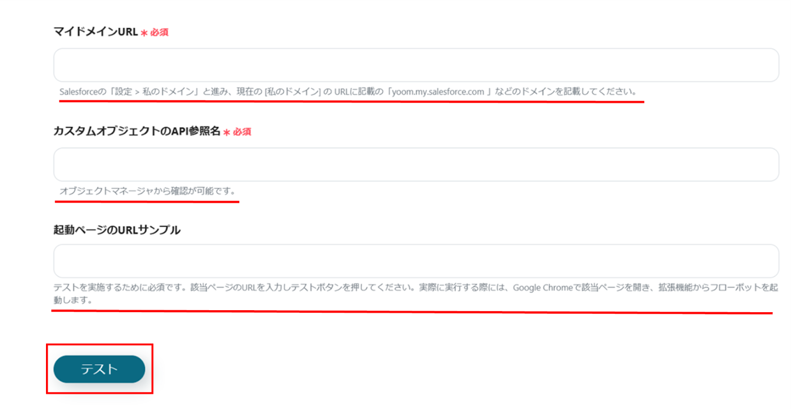 (3)「拡張機能で起動するアプリのAPI接続設定」画面から、赤線を確認の上、マイドメインURL、カスタムオブジェクトのAPI参照名、起動ページのURLサンプルを入力します。