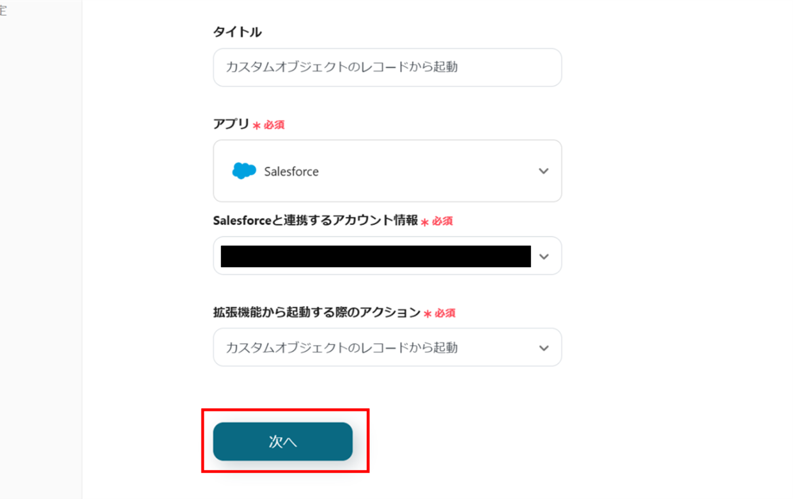 下へ進み、Salesforceと連携するアカウント情報に誤りがないかを確認し、拡張機能から起動する際のアクションは「カスタムオブジェクトのレコードから起動」のままで「次へ」をクリックします。