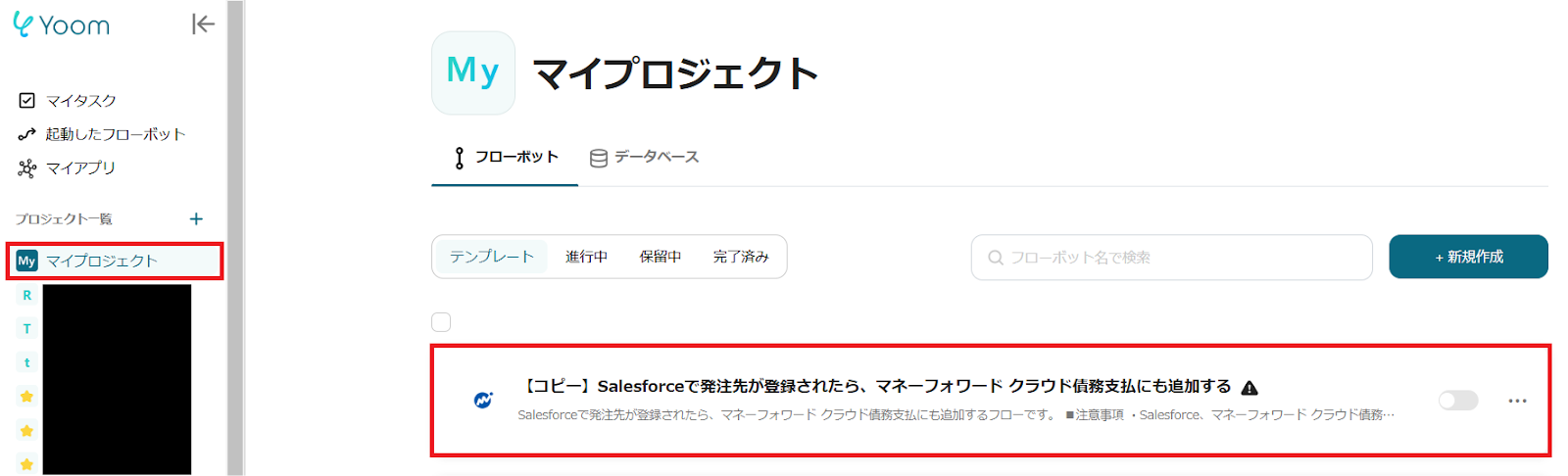 1.Yoom管理画面の「マイプロジェクト」を選択し、「【コピー】Salesforceで発注先が登録されたら、マネーフォワード クラウド債務支払にも追加する」をクリックします。
