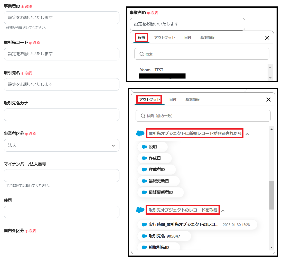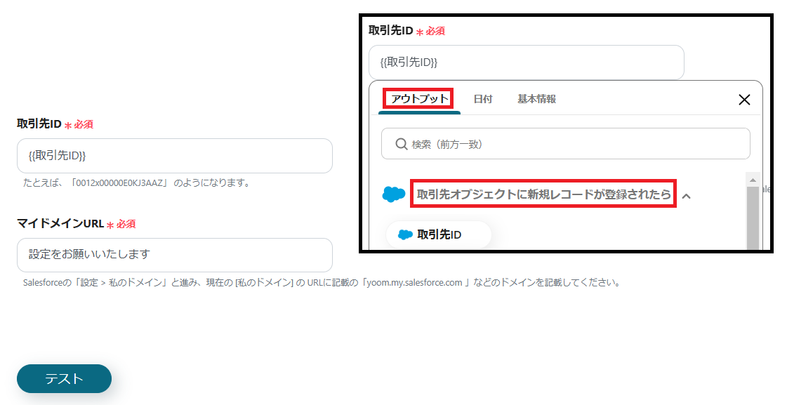 ※取引先IDは、枠をクリックして表示されるアウトプットの「取引先オブジェクトに新規レコードが登録されたら」から設定します。(値は二重括弧で表示されます)