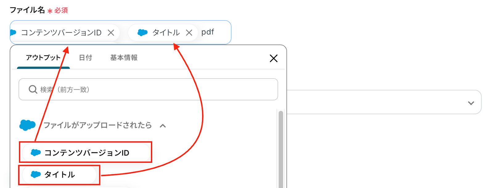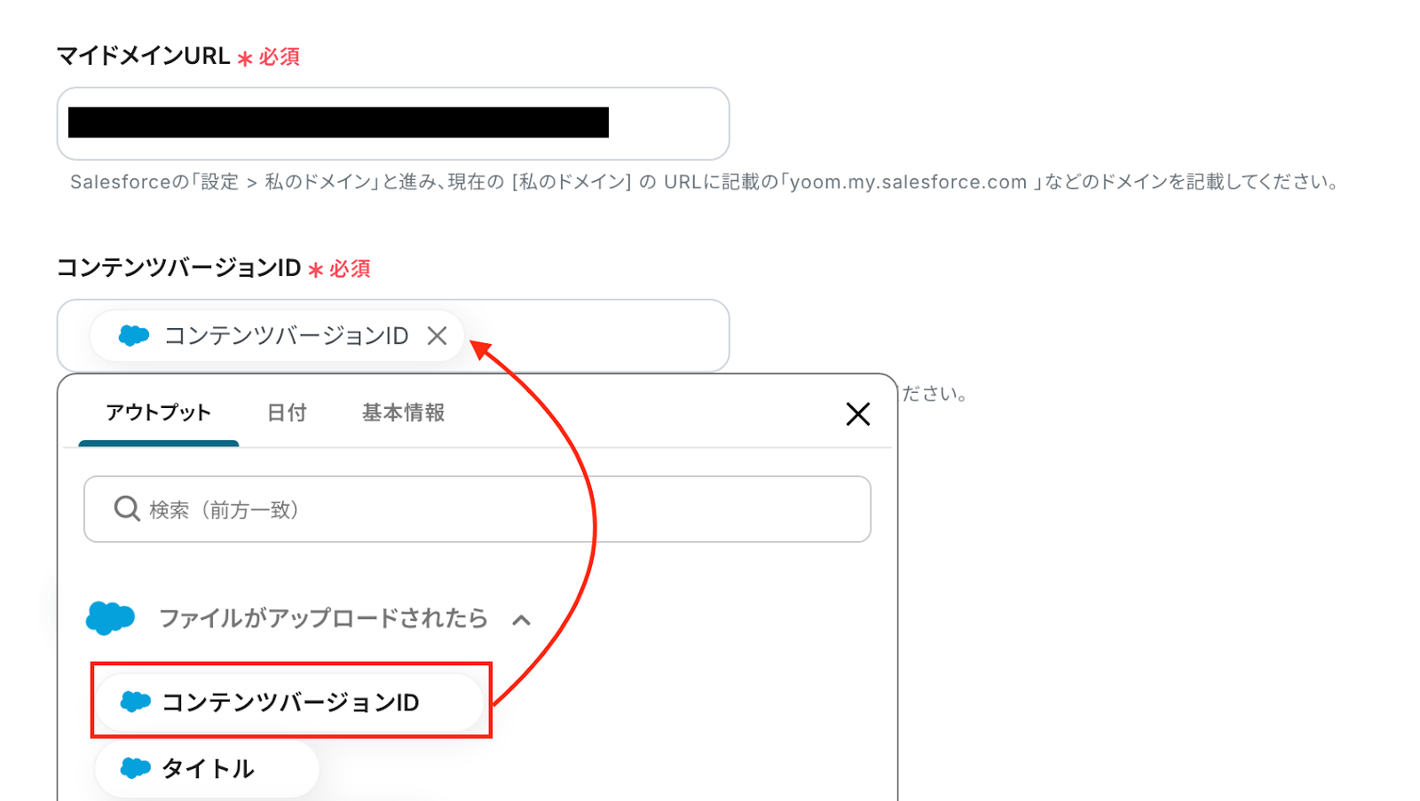 コンテンツバージョンIDは、入力欄をクリックして表示される「アウトプット(取得した値)」から選んで設定しましょう。