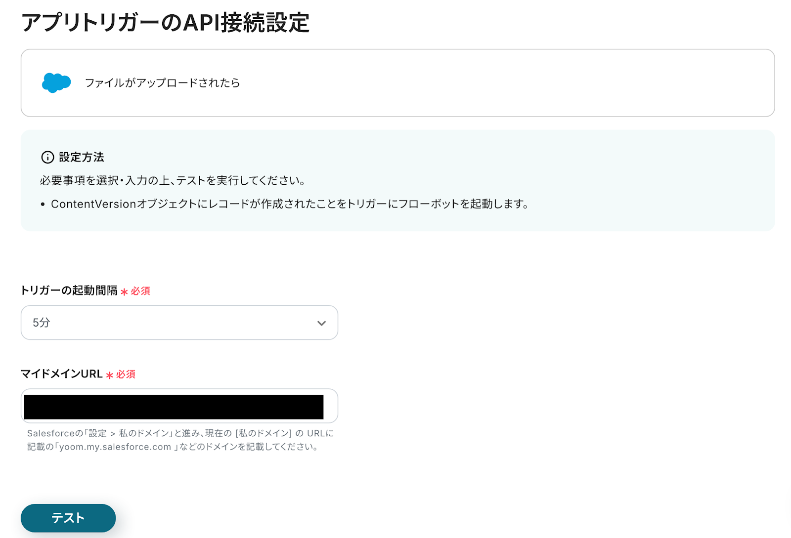 「マイドメインURL」は、入力欄下の注釈を参照し、Salesforceで取得したマイドメインURLを入力してください。