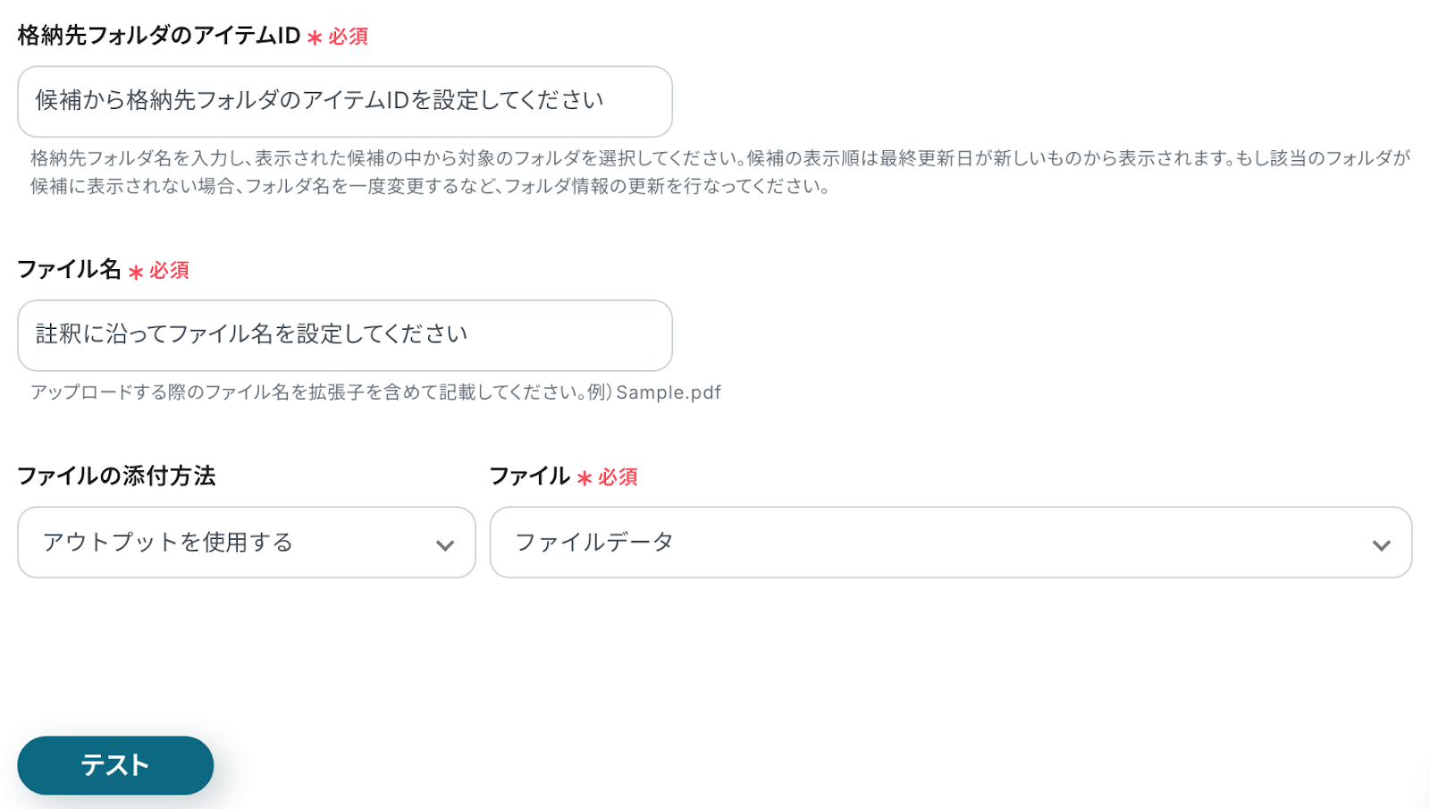 アウトプットとは、トリガーやオペレーション設定時に、「テスト」を実行して取得した値のことを指します。