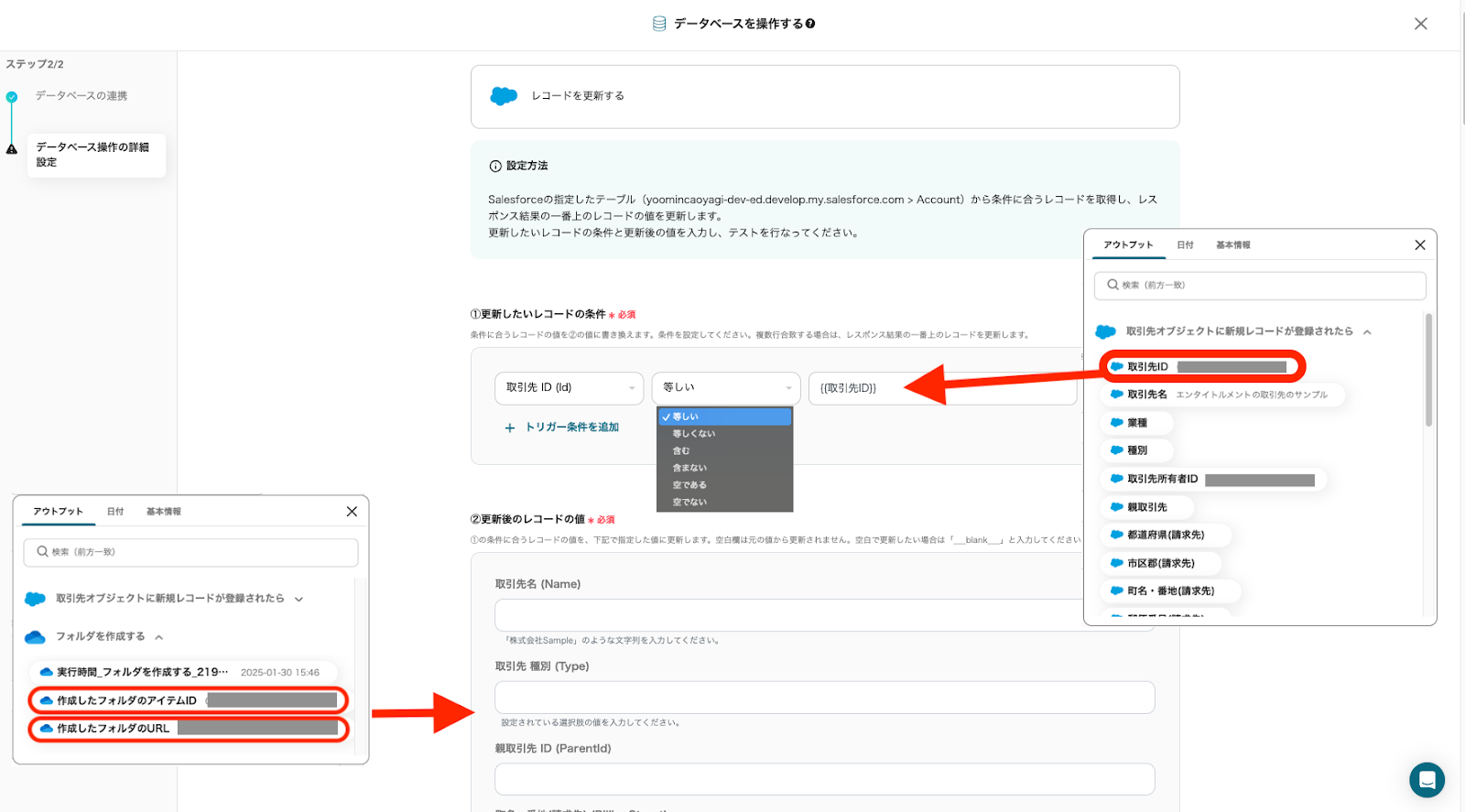 今回は、「Salesforceに保存されている取引先IDと、フォルダ作成を行なった取引先IDが等しい場合」という条件を設定しました。