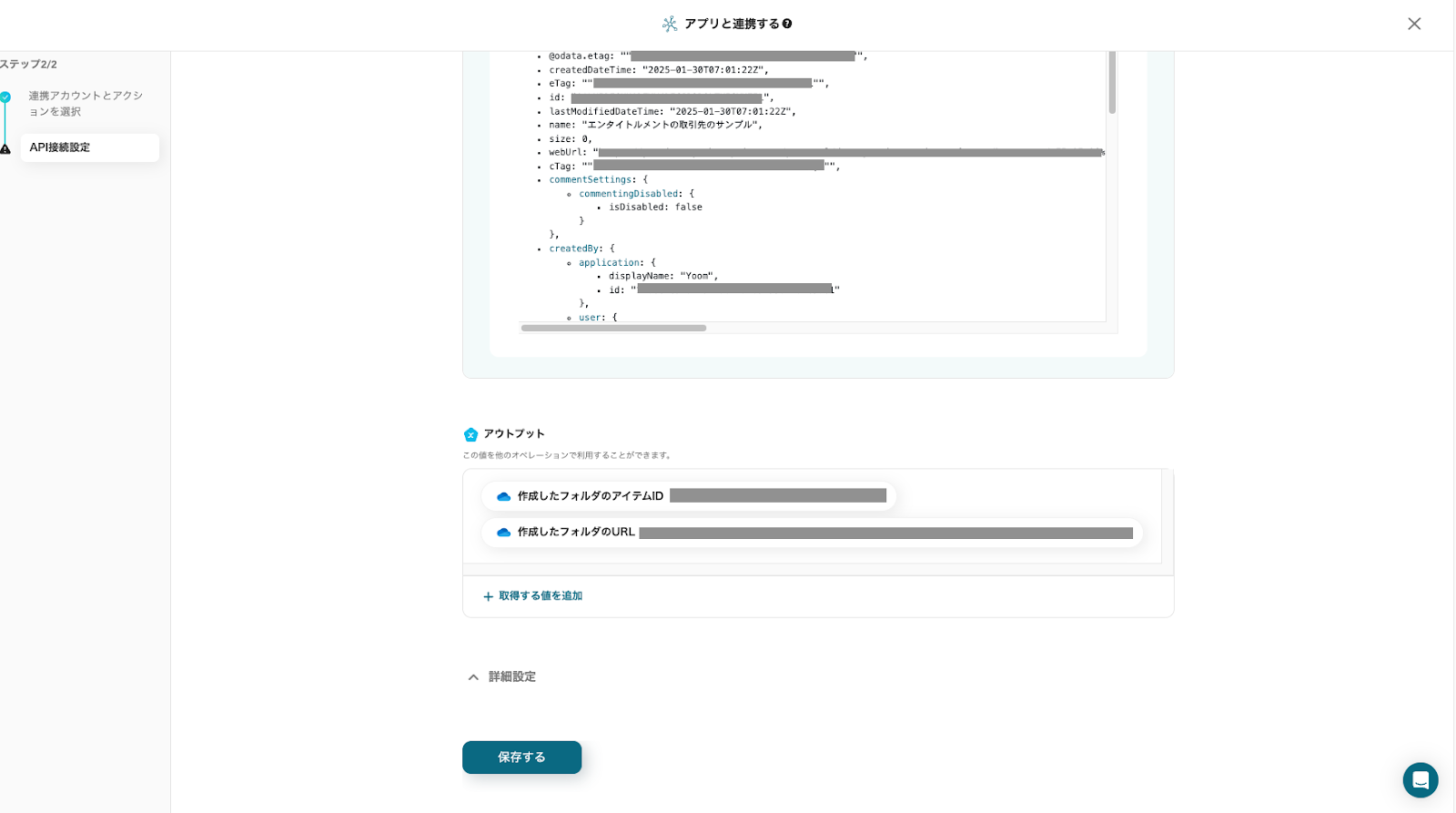 アウトプットに表示された情報を確認し、「保存する」をクリックしてください。