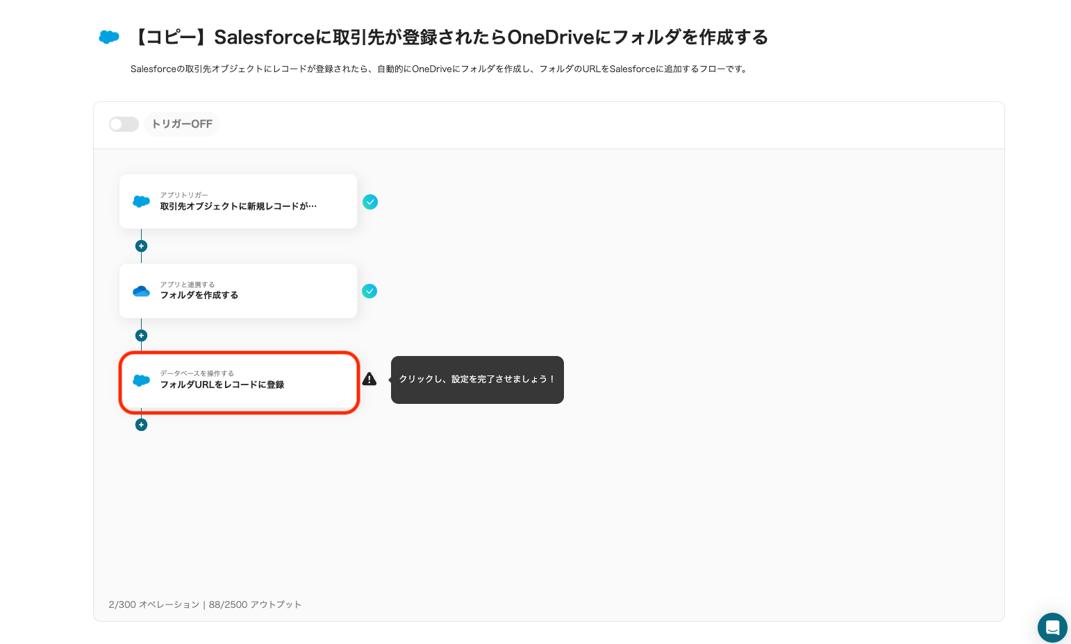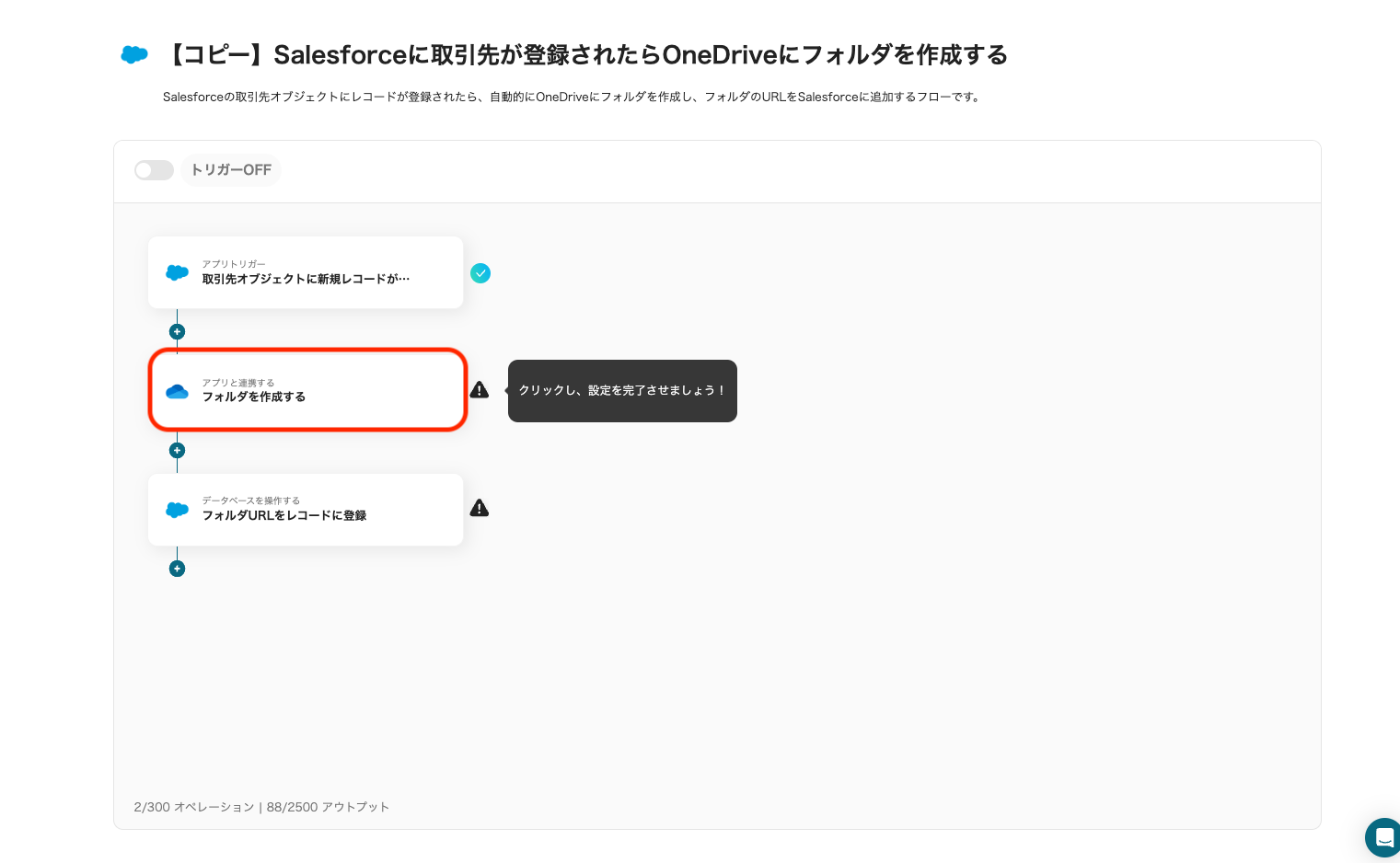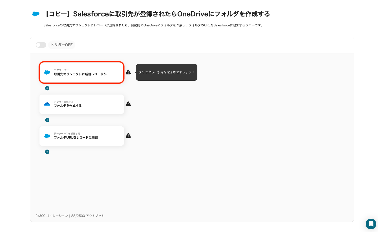 ※Salesforceはチームプラン・サクセスプランでのみご利用いただけるアプリとなっております。フリープラン・ミニプランの場合は設定しているフローボットのオペレーションやデータコネクトはエラーとなりますので、ご注意ください。