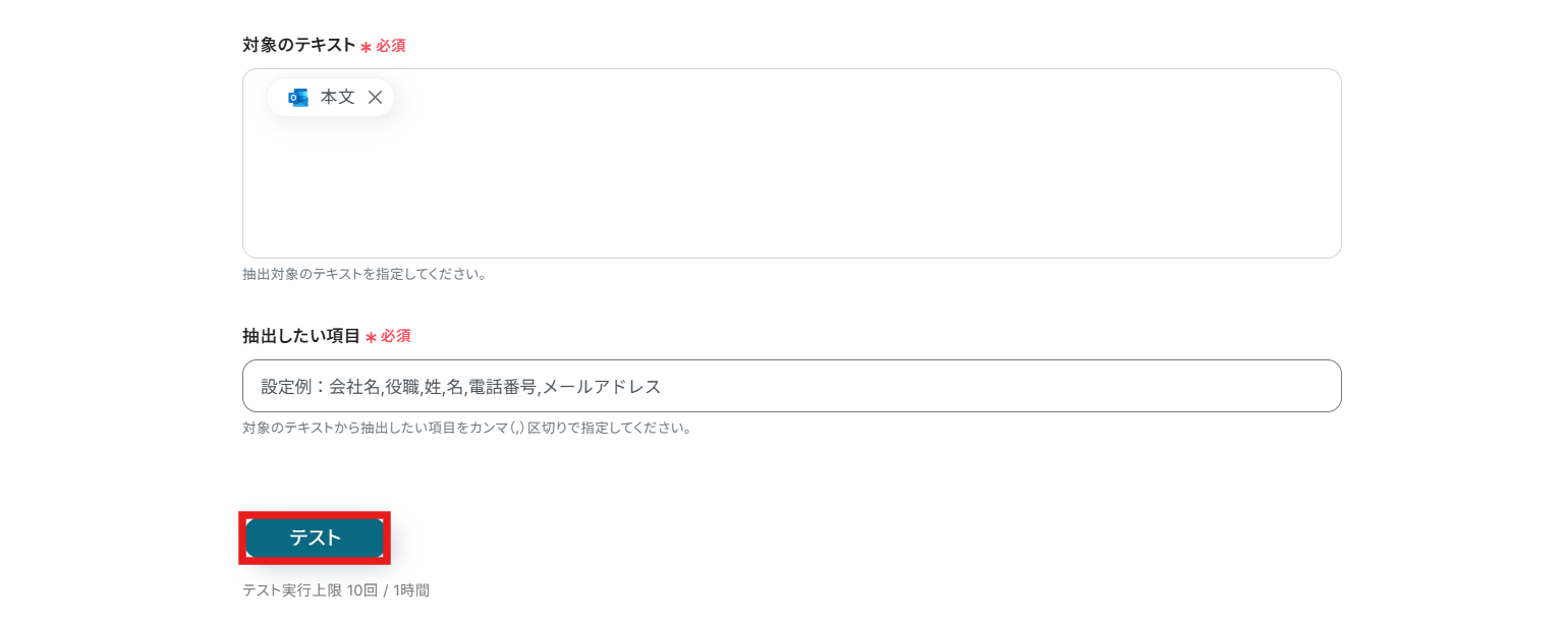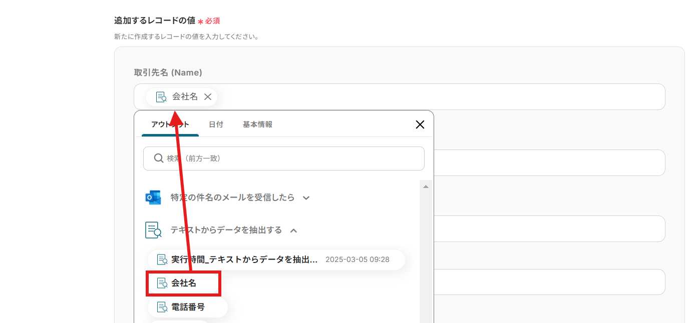 各項目は入力欄→テキストからデータを抽出する順番でクリックすると、以下の画像のように先ほどテキストデータ(Outlook)から抽出した情報が表示されるので、活用してください。