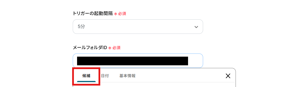 トリガーの起動間隔、メールフォルダID、キーワードを設定します。