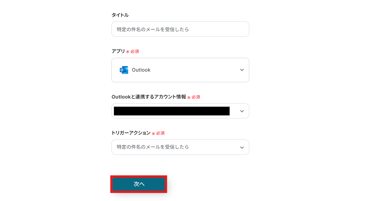 トリガーは「特定の件名のメールを受信したら」を選択します。設定が終わったら「次へ」をクリックします。