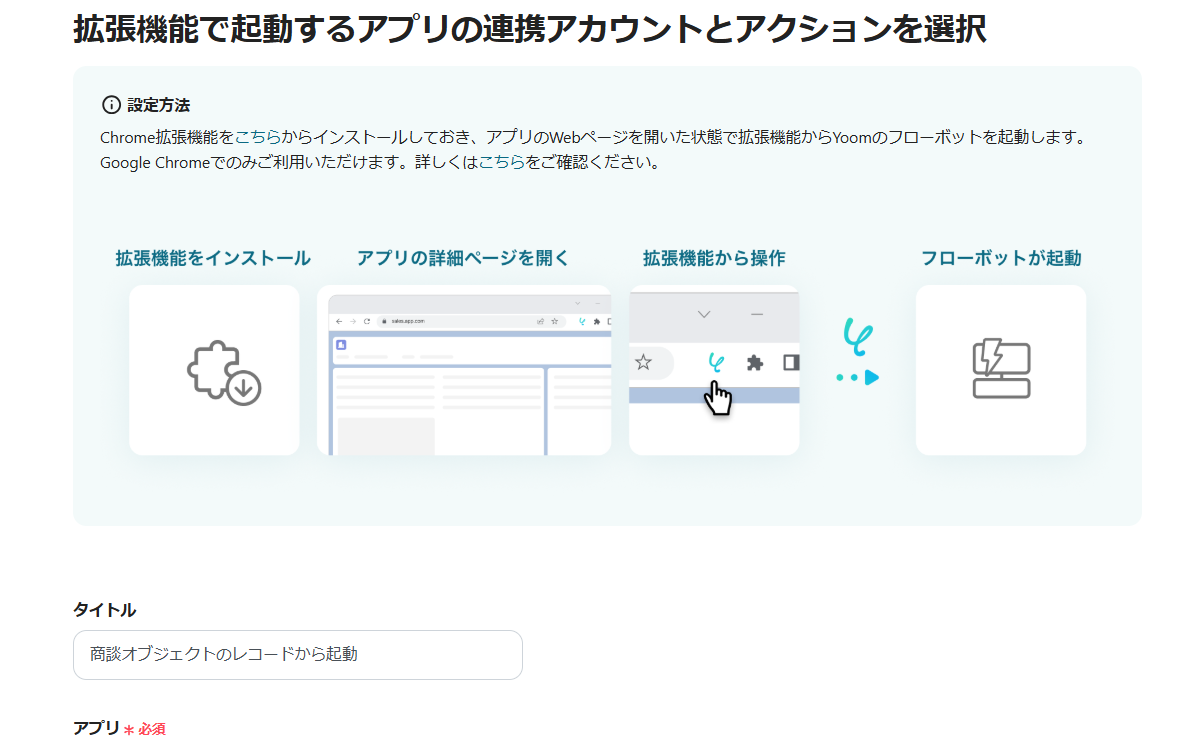 1) Chrome拡張機能をインストールしておき、アプリのWebページを開いた状態で拡張機能からYoomのフローボットを起動します。
