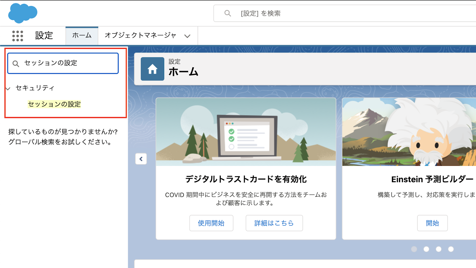 左上の検索フォームに「セッションの設定」と入力し、表示されたメニューから「セッションの設定」をクリックしてください。
