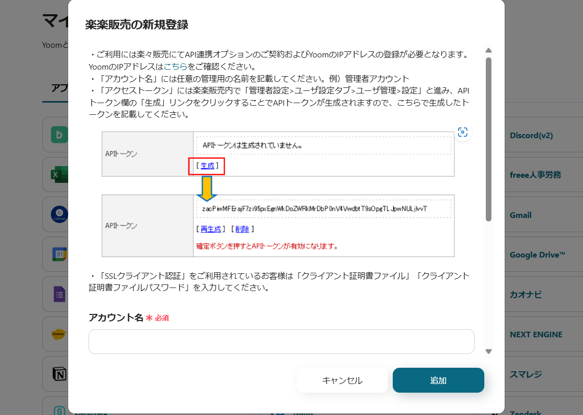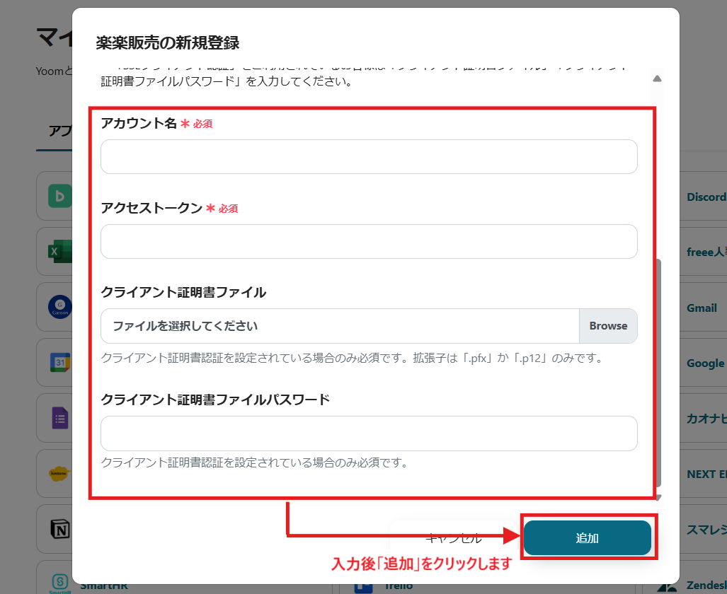 同様に楽楽販売を選択したら、事前準備で取得した情報を基に必要事項を入力し、「追加」をクリックします。