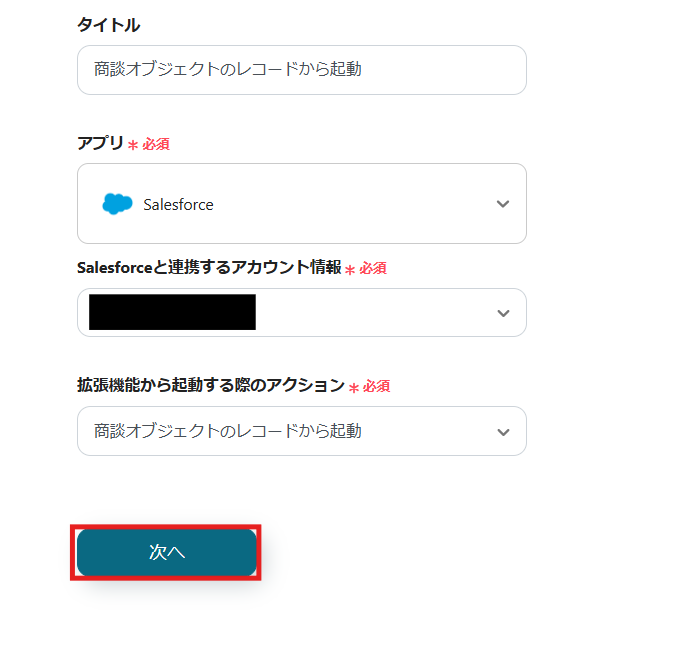 2) アクションは「商談オブジェクトのレコードから起動」を選択し、「次へ」をクリックします。