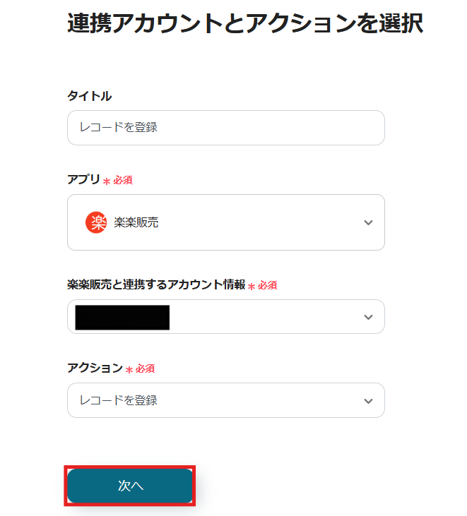 2) アクションは「レコードを登録」を選択し、「次へ」をクリックします。
