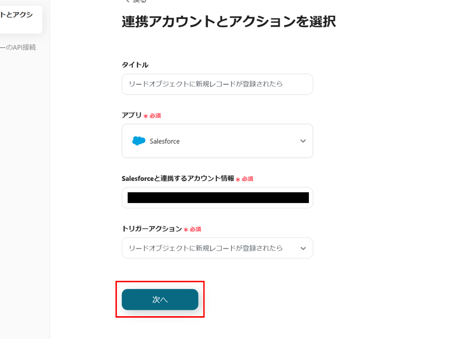(2)Salesforceの「連携アカウントとアクションを選択」画面から、Salesforceと連携するアカウント情報に誤りがないかを確認し、トリガーアクションは「リードオブジェクトに新規レコードが登録されたら」のままで「次へ」をクリックします。