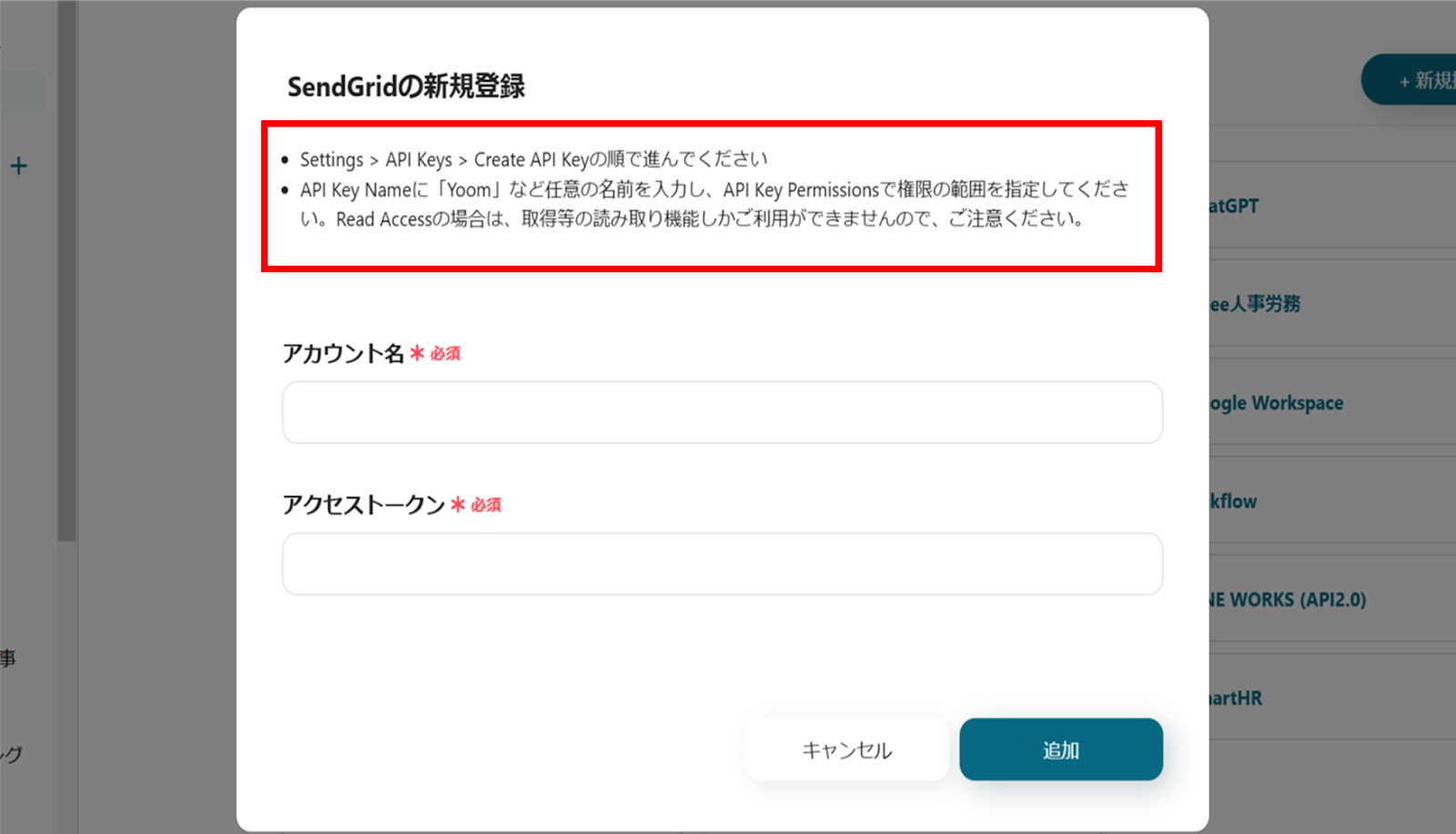 (5)「SendGridの新規登録」画面から、赤枠を確認の上、アカウント名、アクセストークンを入力します。