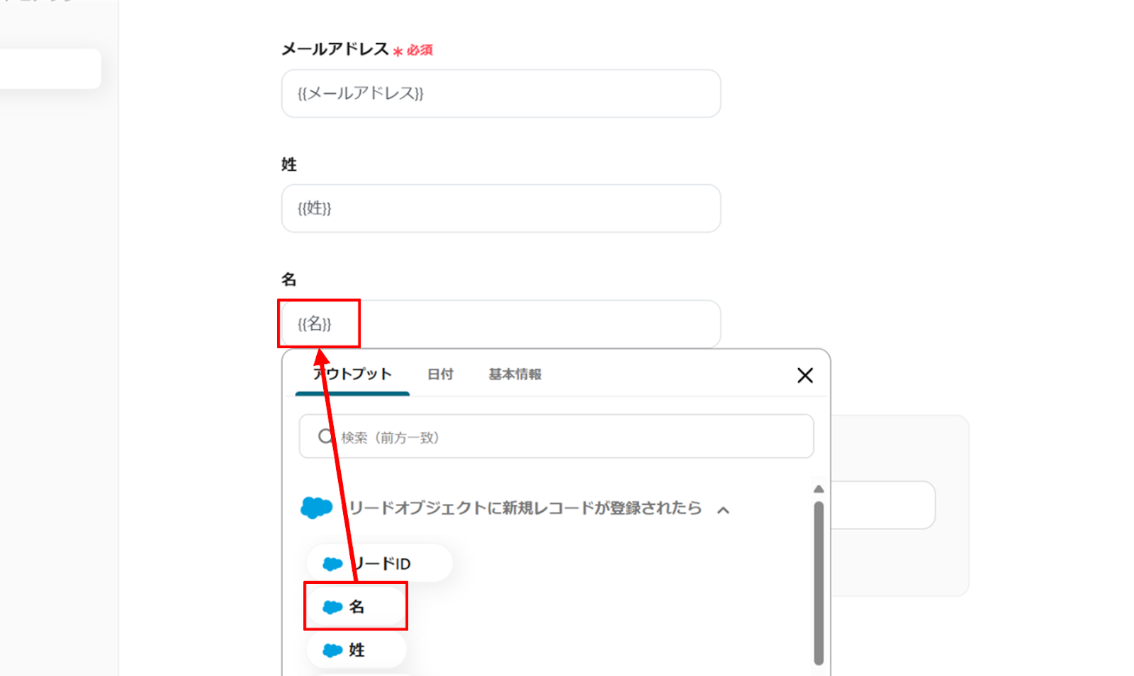 (3)「API接続設定」画面から、アウトプットを使用して、メールアドレス、姓、名を入力します。
