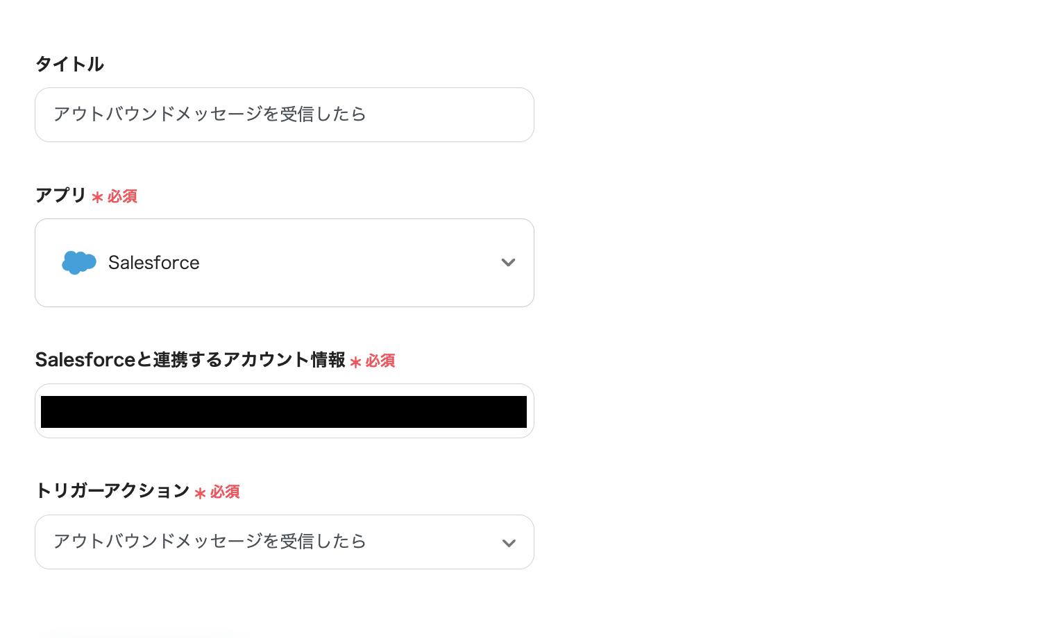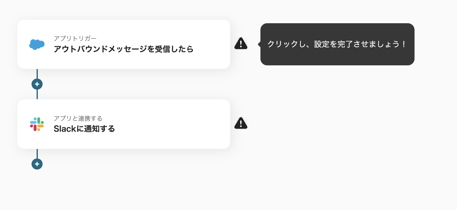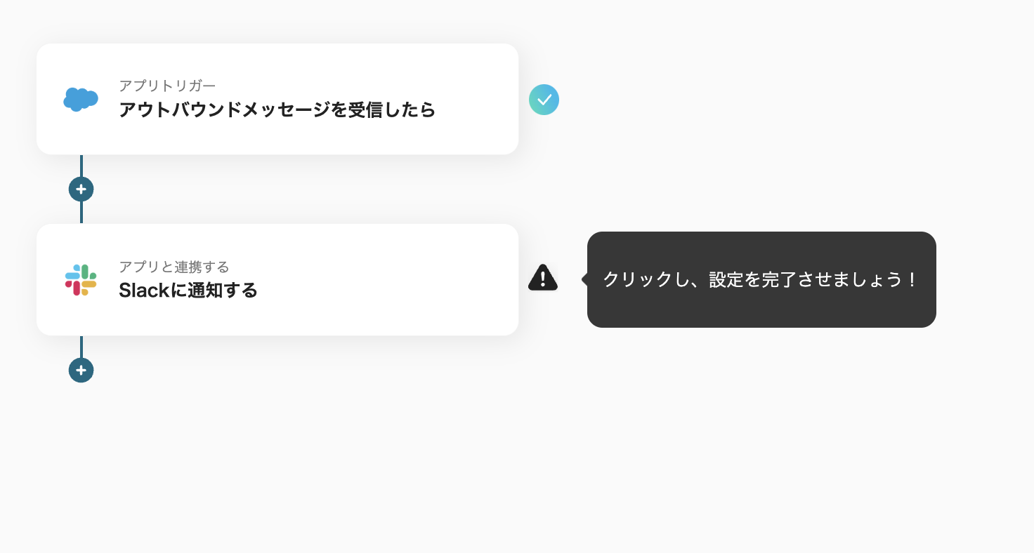 ステップ3:Salesforceのトリガー設定 まず、1つ目のステップ「アウトバウンドメッセージを受信したら」をクリックしてください。