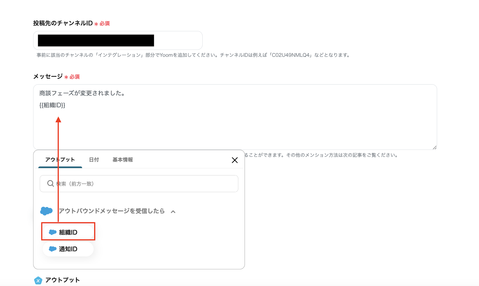以下の画像のように、前ステップから取得したアウトプットも引用可能です。今回は例として「組織ID」を選択しています。