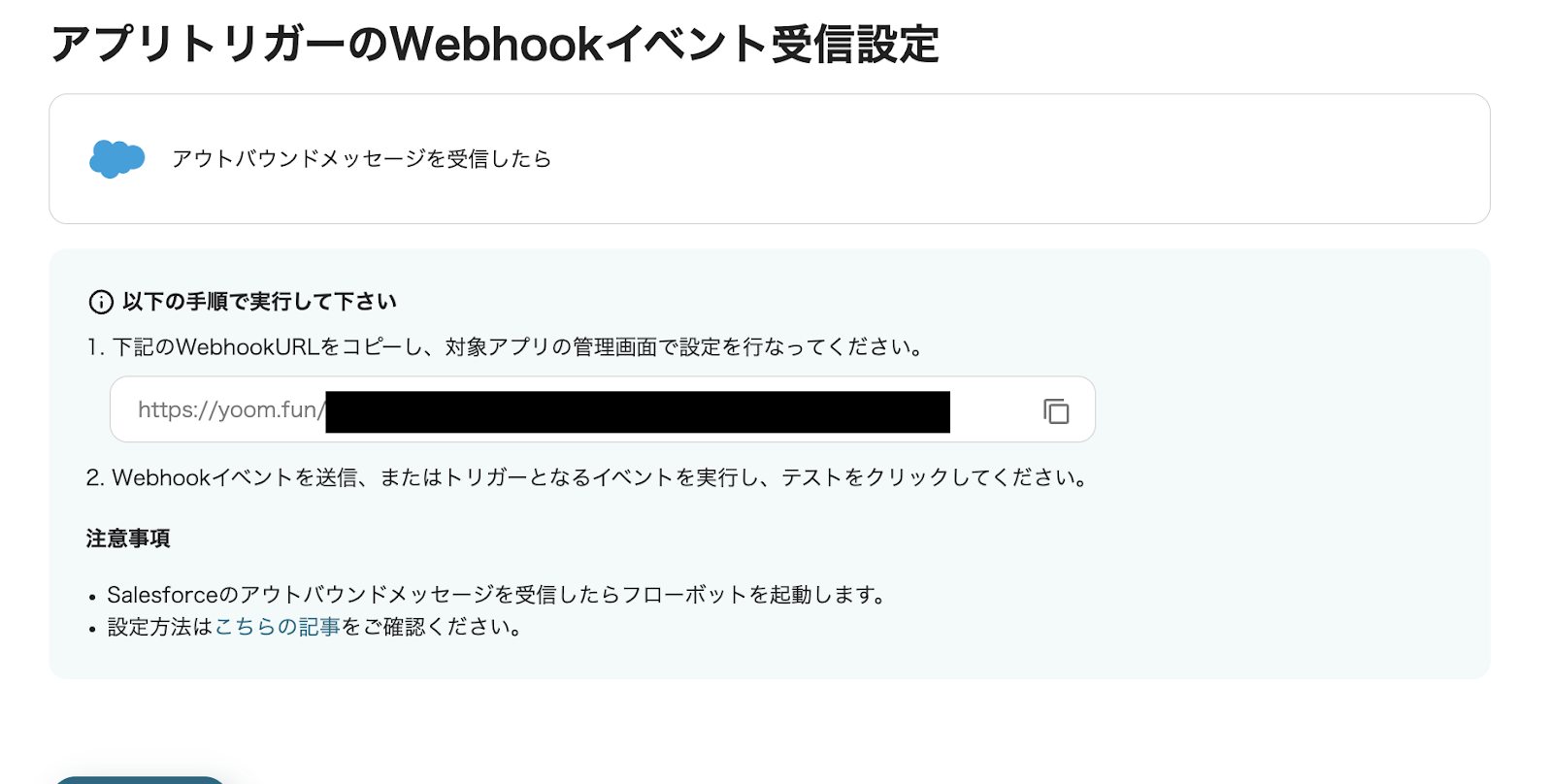 次の画面では、WebhookURLをコピーし、管理画面で設定を行う必要があります。