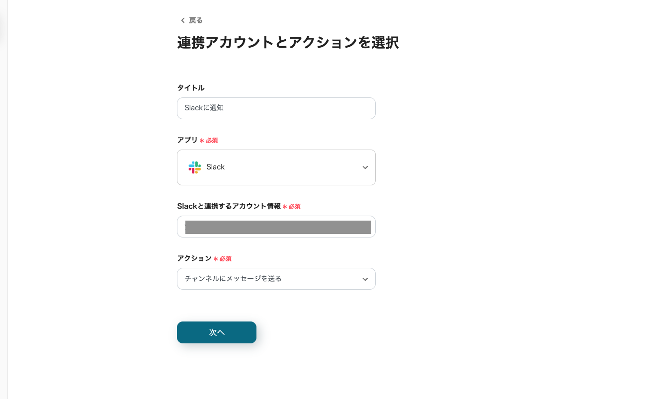 タイトルは自由に編集できますが、トリガーアクションは変更せずに「次へ」をクリックしてください。