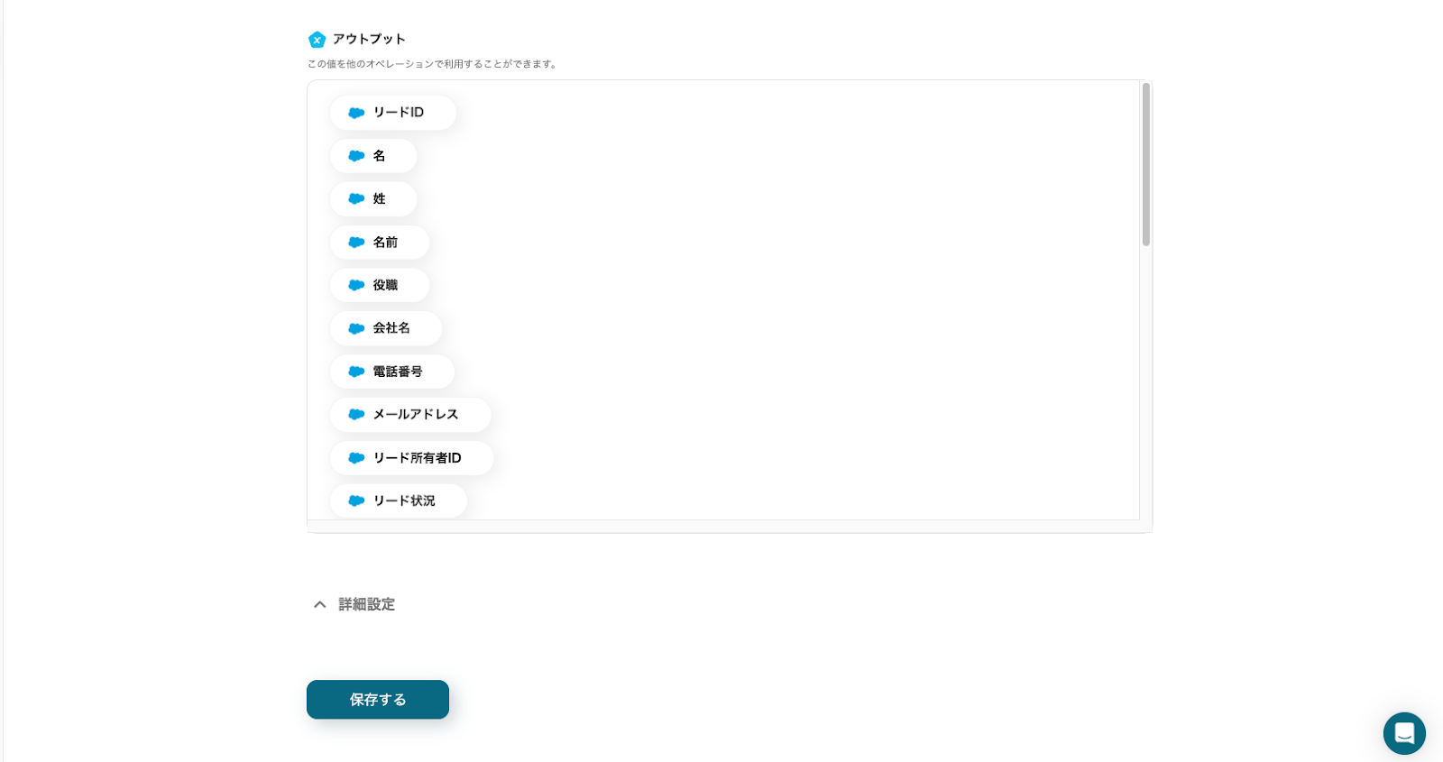 アウトプットに表示されたSalesforceの情報を確認し、「保存する」をクリックしてください。