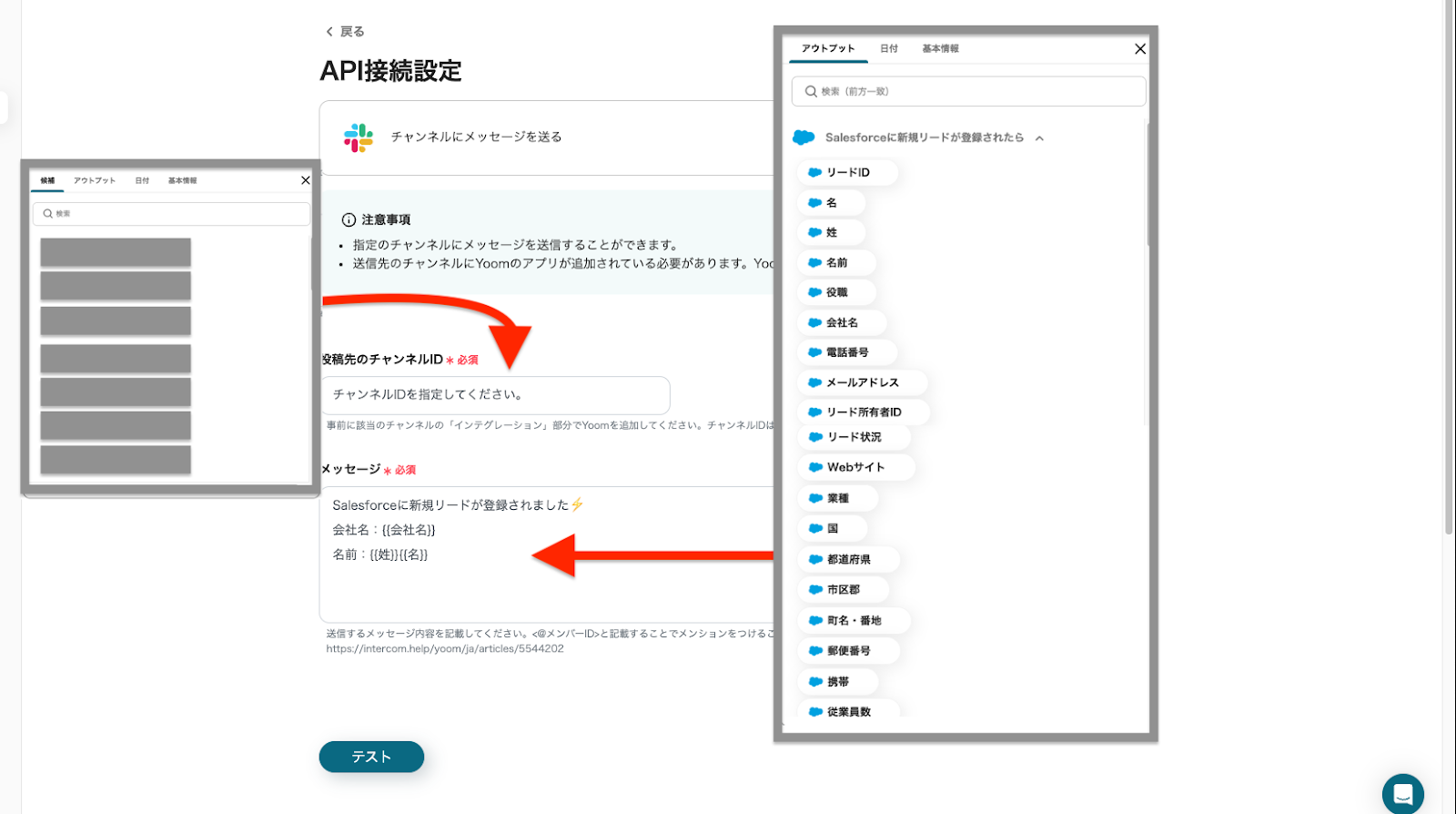 「メッセージ内容」は任意で編集可能です。入力欄をクリックして、Salesforceから取得したリード情報を追加できます。今回は会社名と名前を含むメッセージを登録しました。