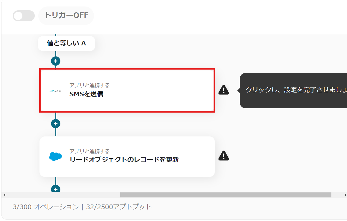 7)フローに戻ったら、分岐先の「アプリと連携する SMSを送信」のアイコンをクリックします。