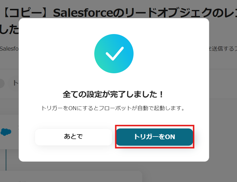 14)最後までに設定すると以下のような表示が出てくるので、「トリガーをON」をクリックし、フローボットを起動させて、一度正しく作動するか確認してください。