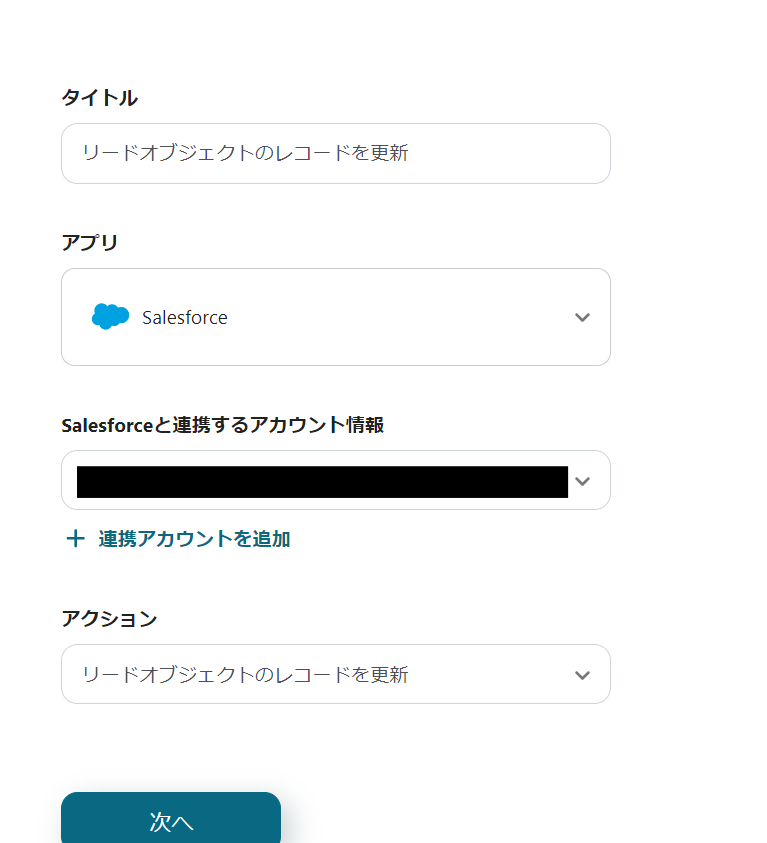 11)アクションは「リードオブジェクトのレコードを更新」を選択して、「次へ」をクリックします。