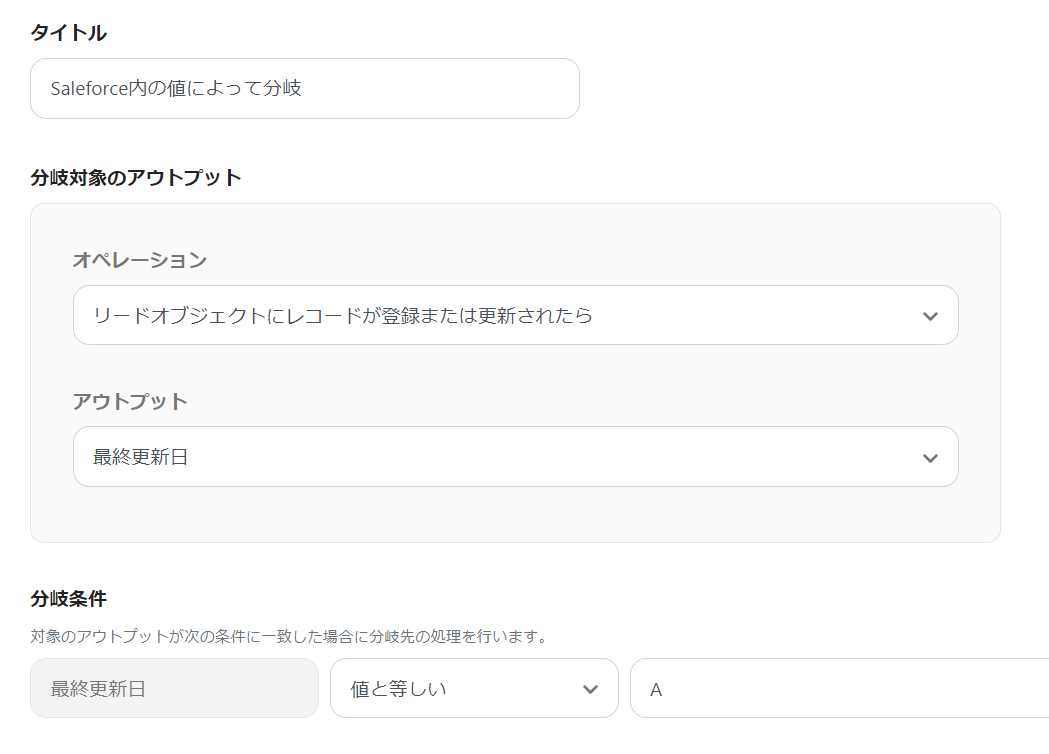 6)フローに戻ったら、「コマンドオペレーション Salesforceの値によって分岐」のアイコンをクリックし、分岐条件が「最終更新日」が「値と等しい」になっていることを確認して保存してください。