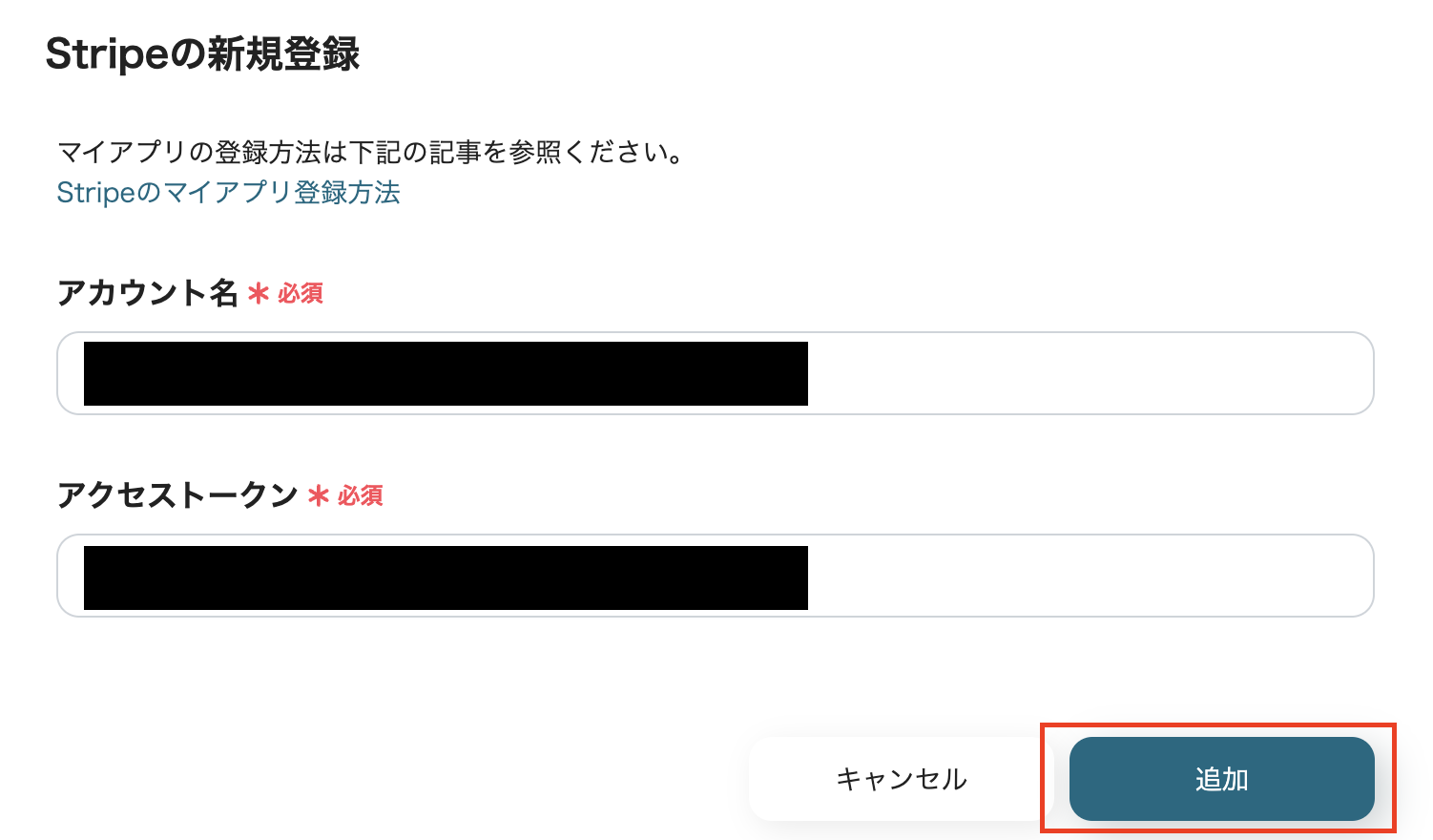 (5)連携するStripeの「アカウント名」と「アクセストークン」を入力し、[追加]をクリックします。