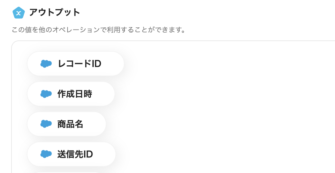 なお、このステップでSalesforceに事前に格納されている情報をアウトプットとして取得することが可能です。