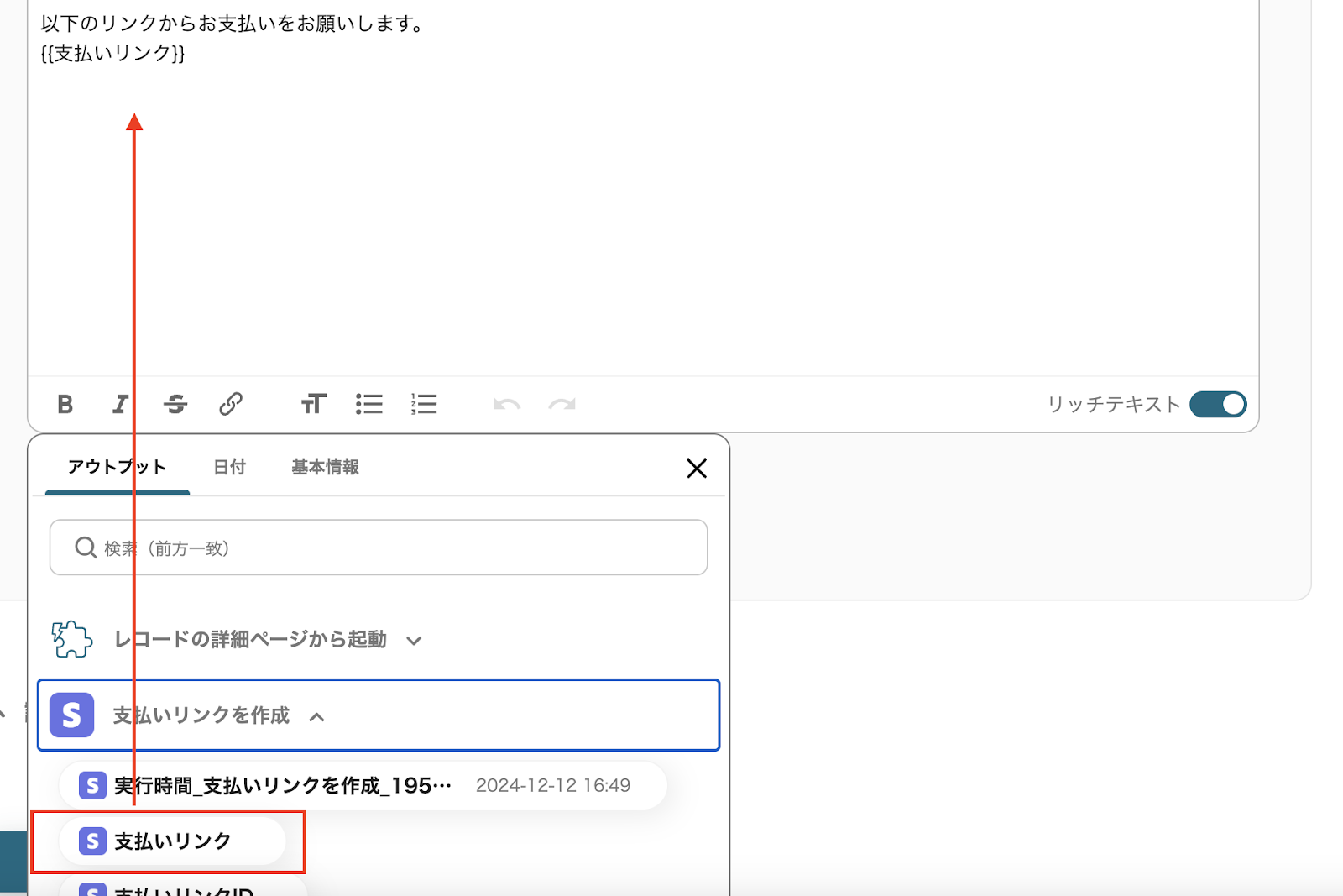 (4)今回のフローでは、支払い用リンクを相手先に送りたいため、「本文」内に、以下の画像のように『支払いリンク』を付与します。