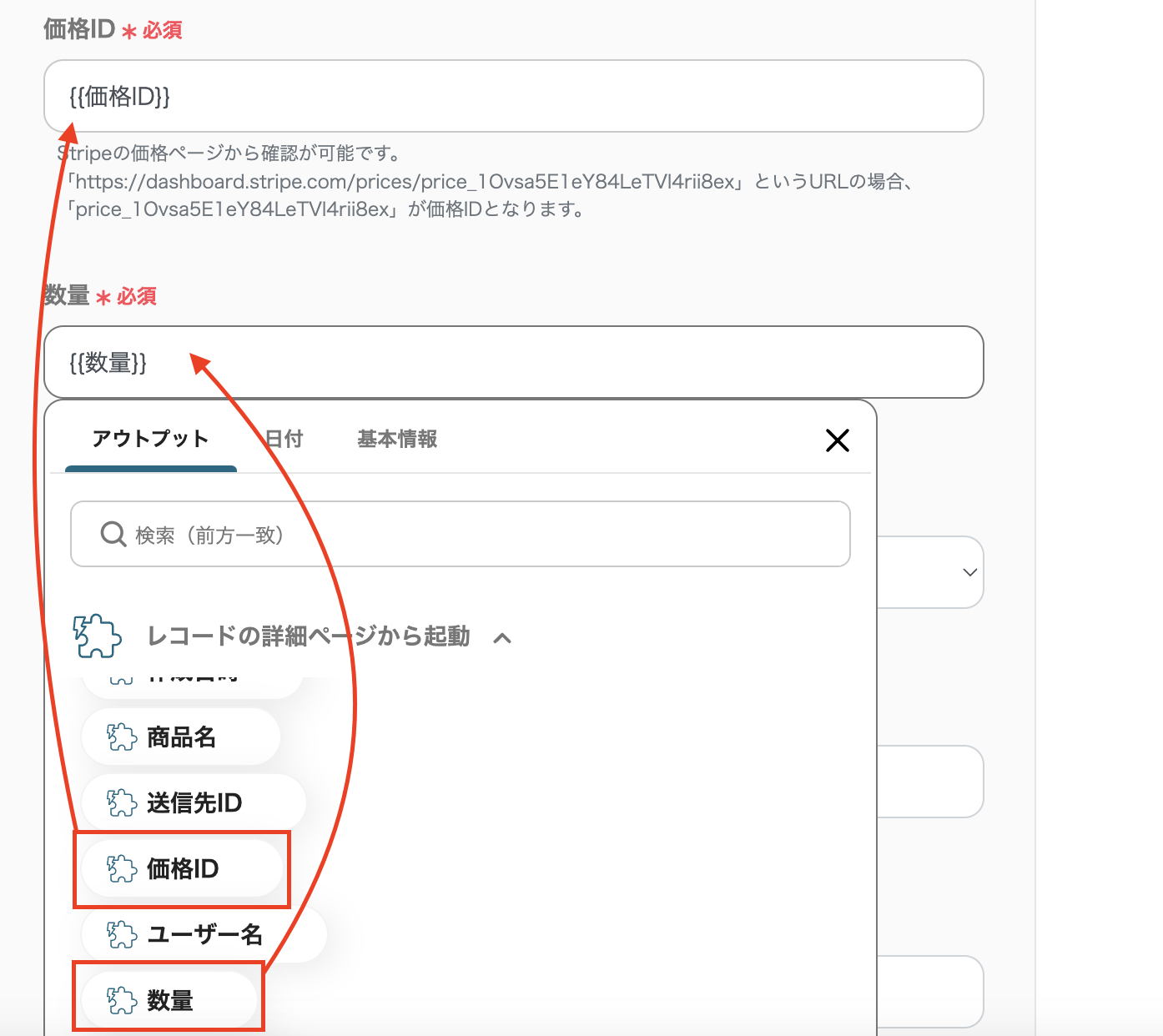 (3)次画面で「価格ID」や「数量」の項目を入力していきましょう。