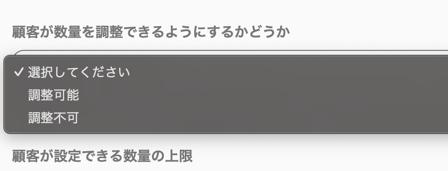 (4)「顧客が数量を調整できるようにするかどうか」の項目は、プルダウンから任意のものを選択することができます。