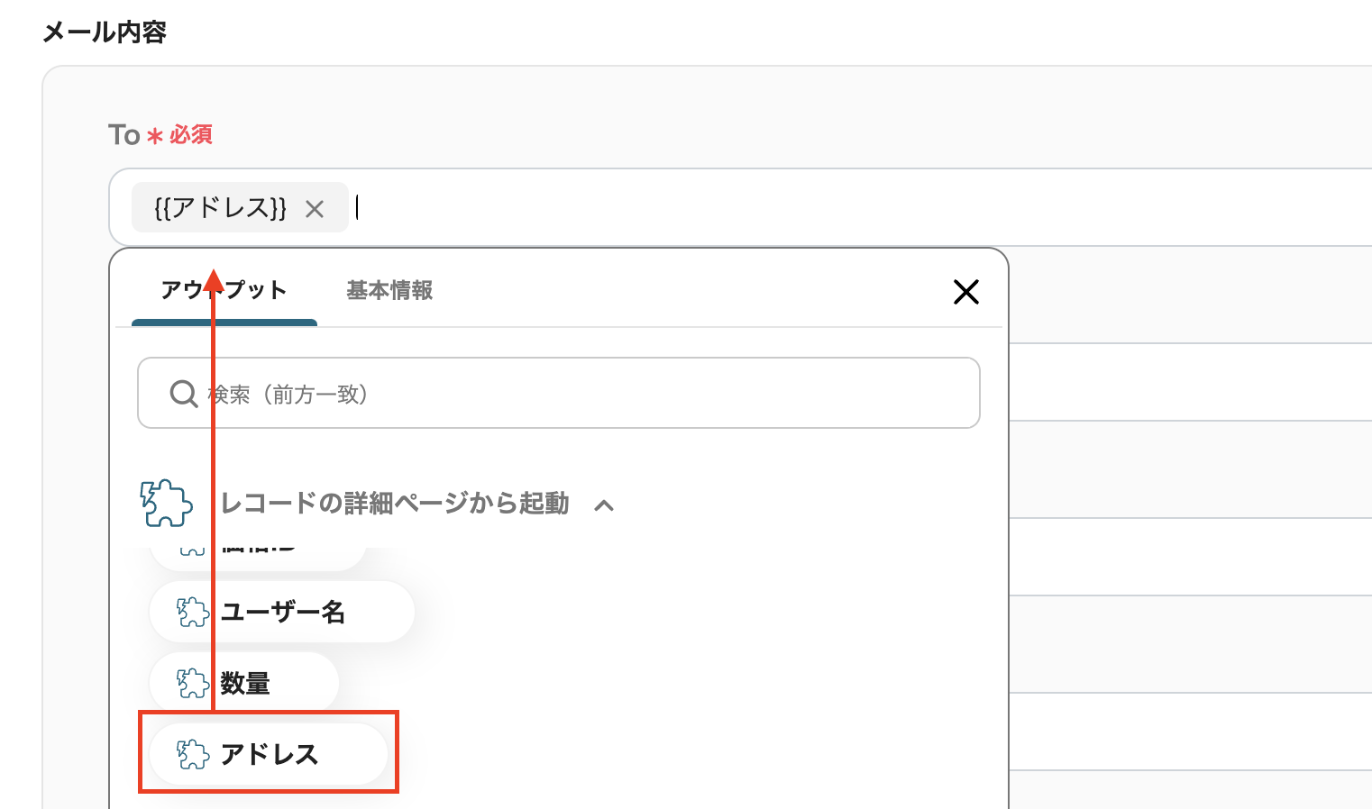 (以下は1つ目のアクションで取得したアウトプット【アドレス】を引用したものです。)
