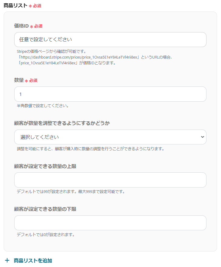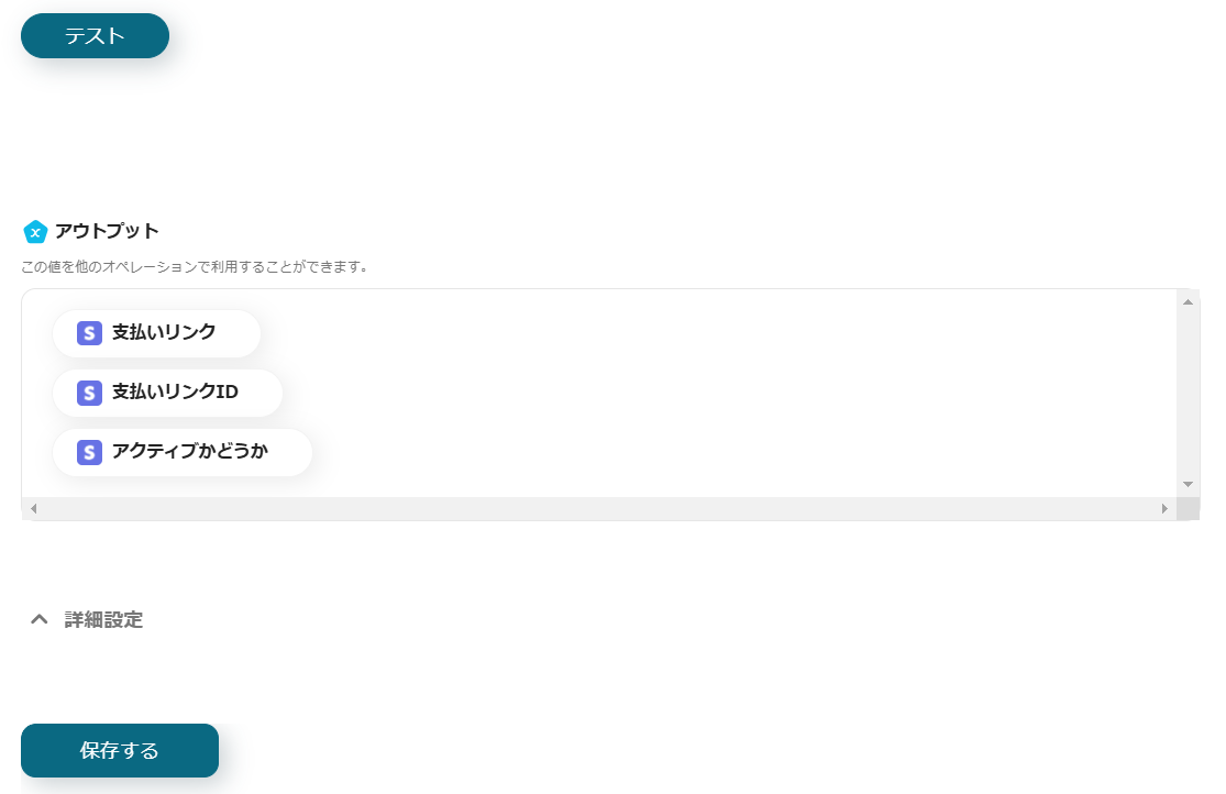 ※Stripeから取得した情報を設定する場合は、枠をクリックして表示されるアウトプットの「支払いリンクを作成」から選択します。(値は二重括弧で表示されます)